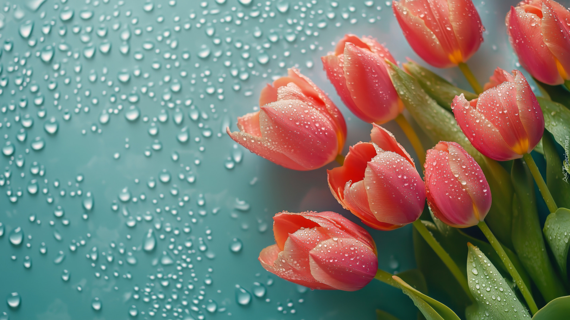 Edytor tapety: Zroszone tulipany z liśćmi