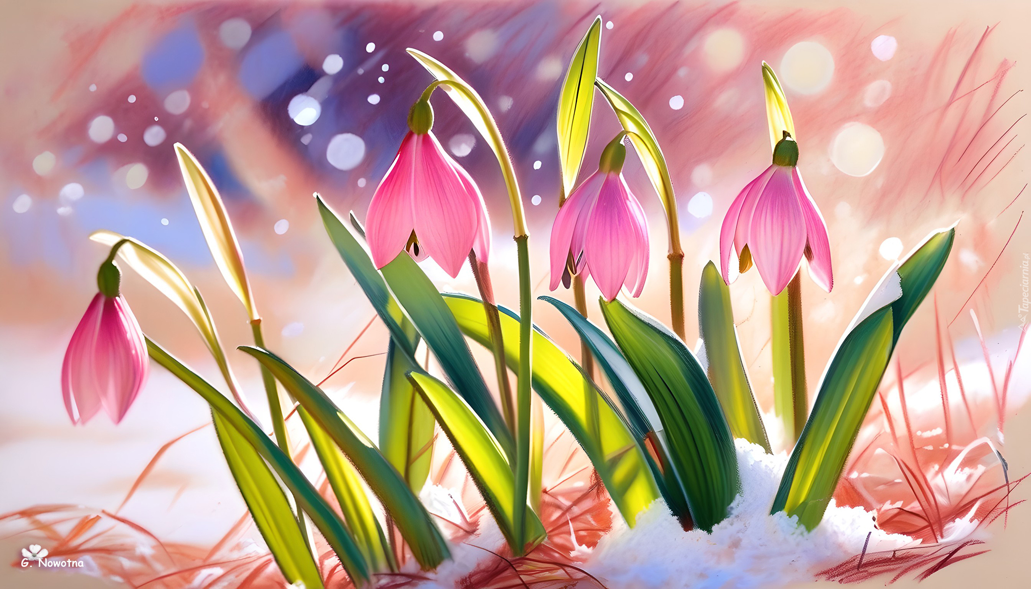Edytor tapety: Cztery pochylone różowe kwiaty w śniegu