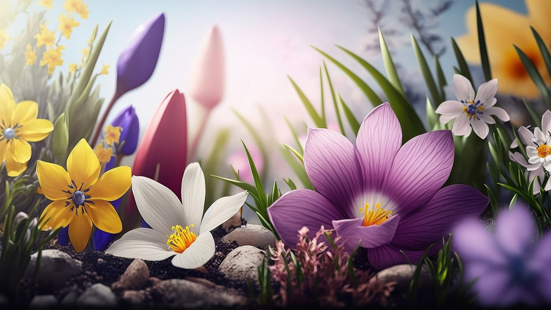 Edytor tapety: Grafika z białymi żółtymi i fioletowymi kwiatami