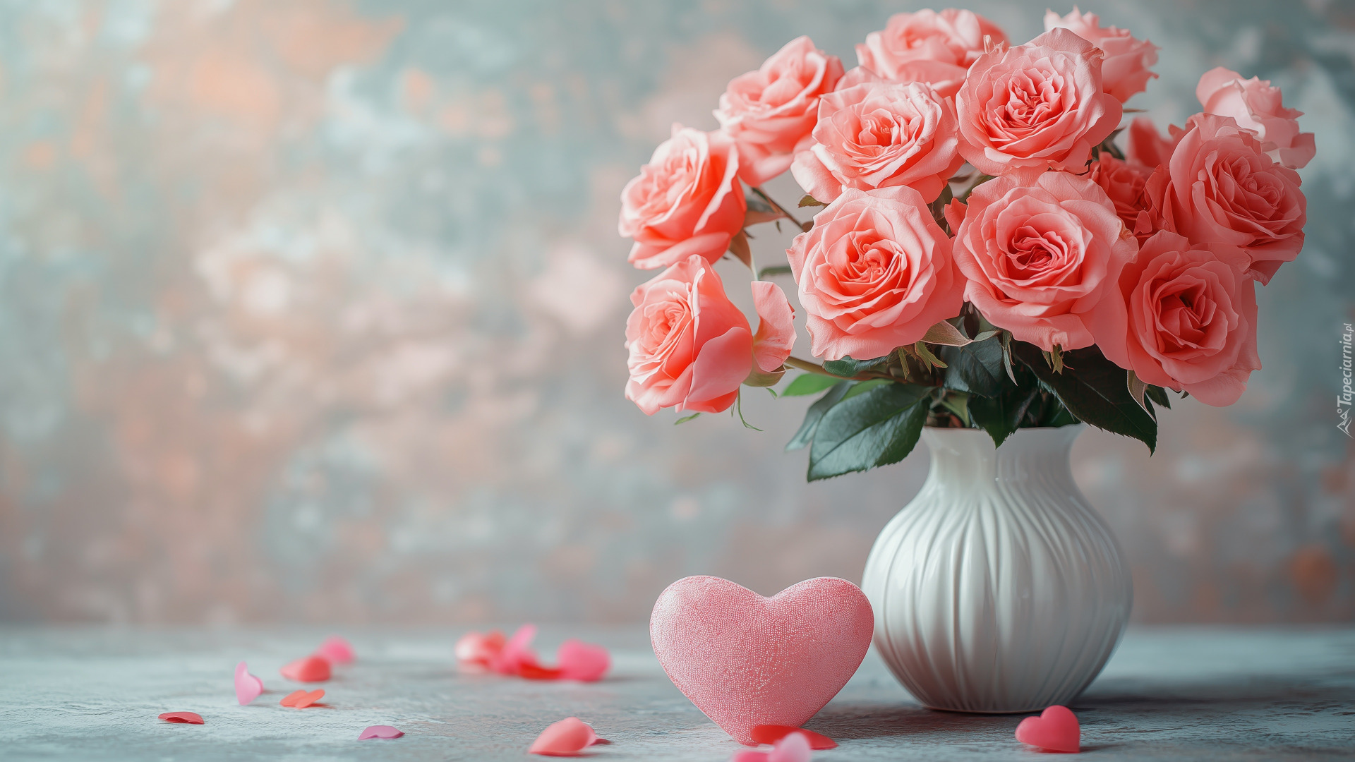 Edytor tapety: Różowe róże w białym wazonie obok serduszek