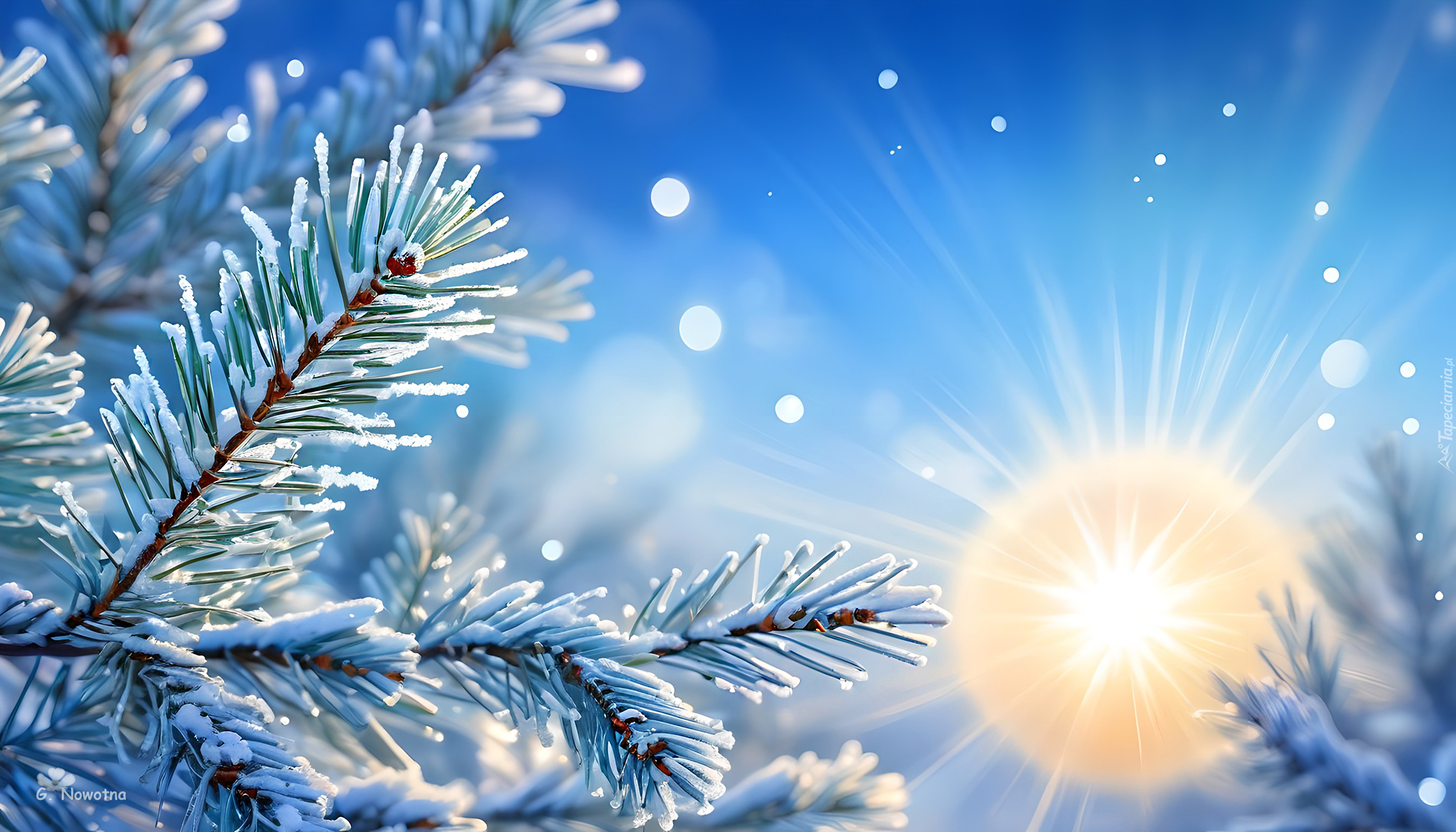 Edytor tapety: Rozświetlone promieniami słońca ośnieżone świerkowe gałązki