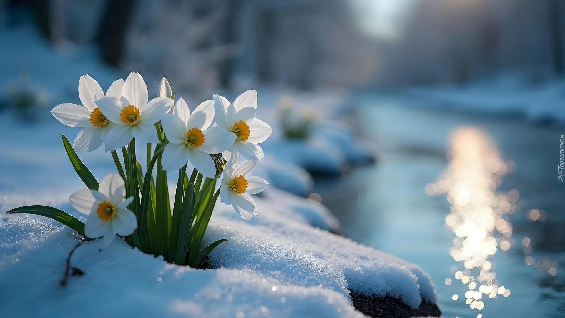 Edytor tapety: Białe narcyzy w śniegu nad rzeką