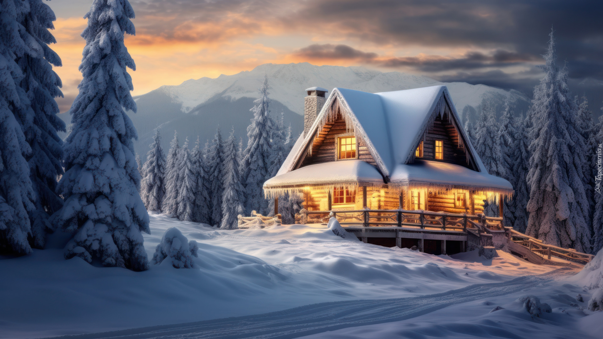 Edytor tapety: Ośnieżone drzewa i oświetlony dom na tle gór