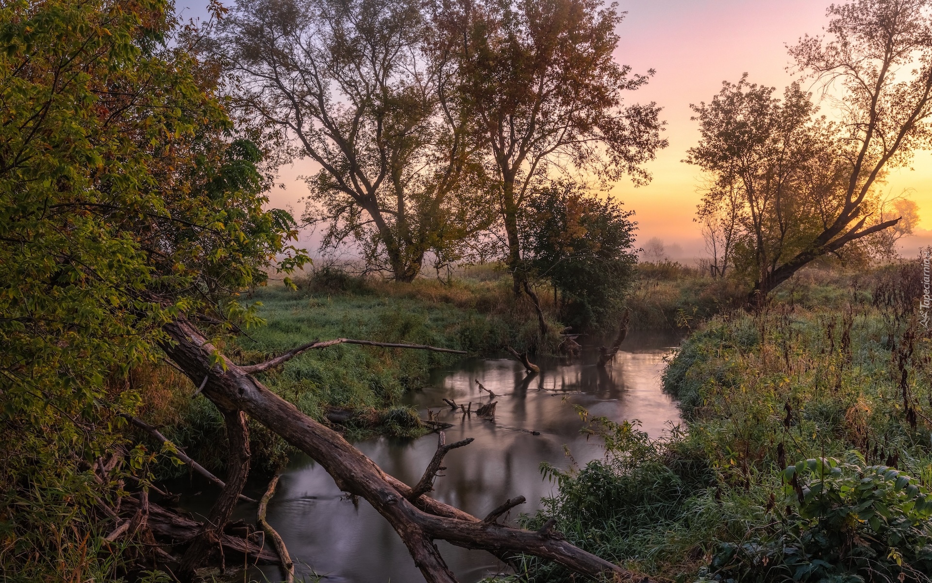 Edytor tapety: Powalone drzewo nad rzeką na tle wschodu słońca