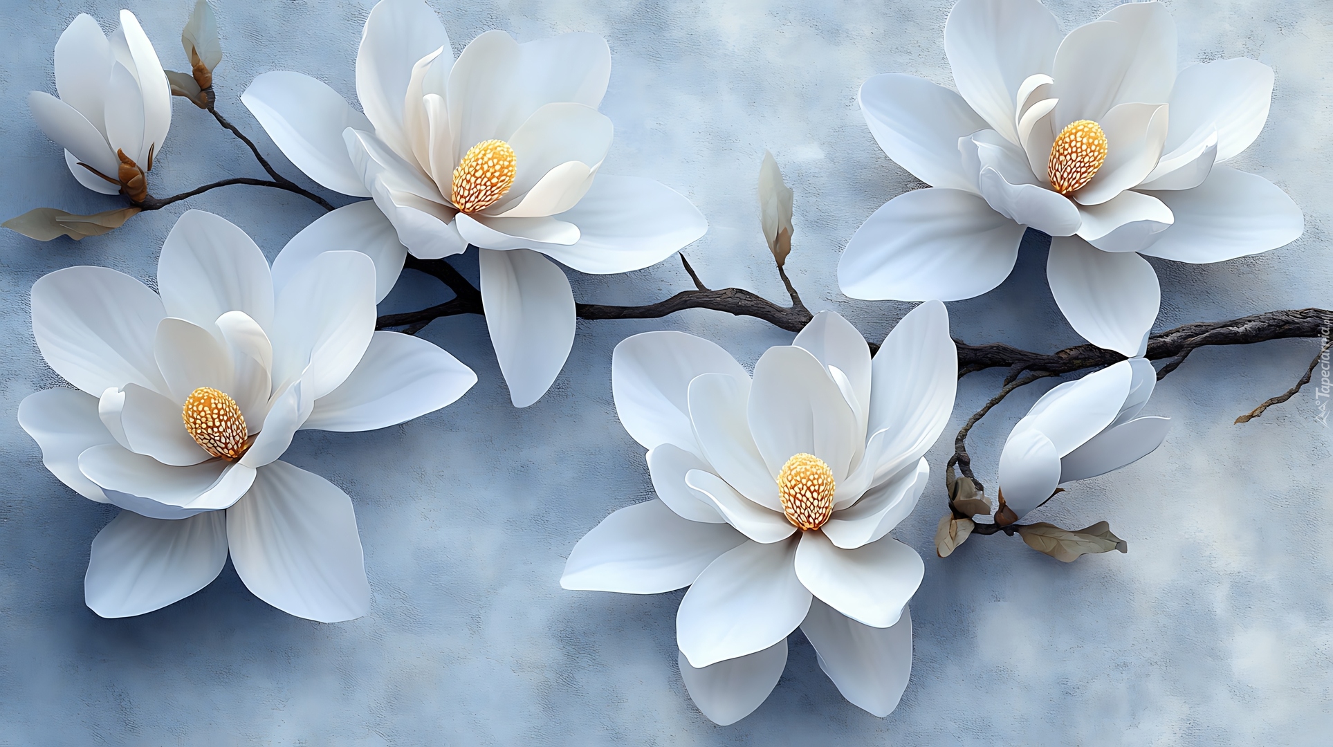 Edytor tapety: Gałązka z białymi kwiatami magnolii na jasnym tle