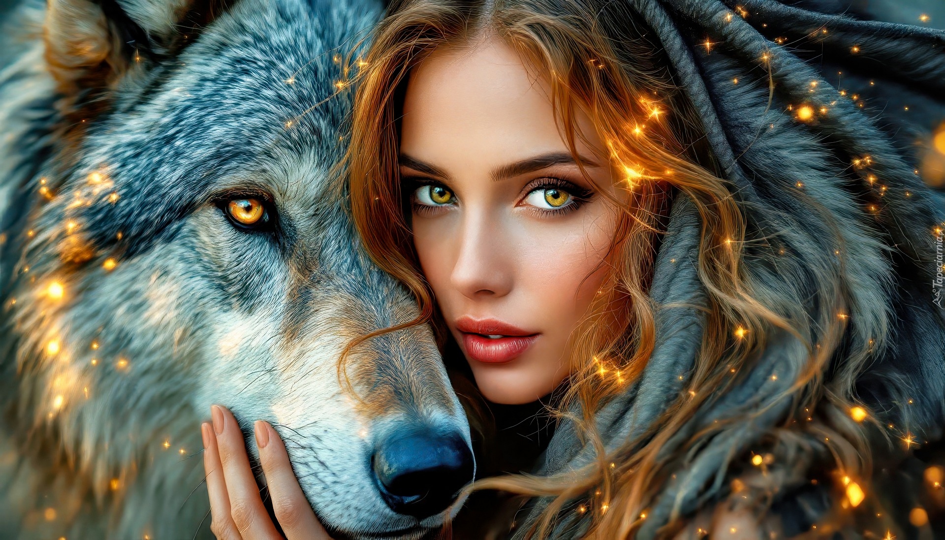Edytor tapety: Kobieta przytulona twarzą do głowy wilka