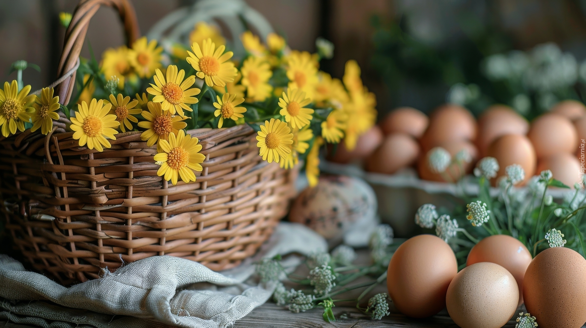Edytor tapety: Jajka obok koszyczka z żółtymi kwiatami