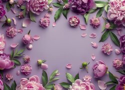 Edytor tapety: Fioletowe kwiaty i płatki piwonii na fioletowym tle
