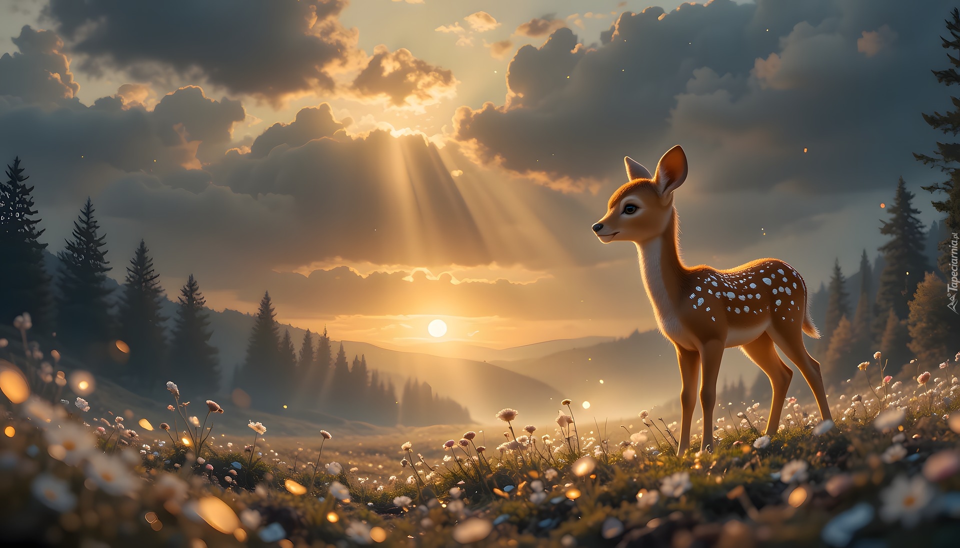 Edytor tapety: Jelonek na ukwieconej łące w słonecznym świetle