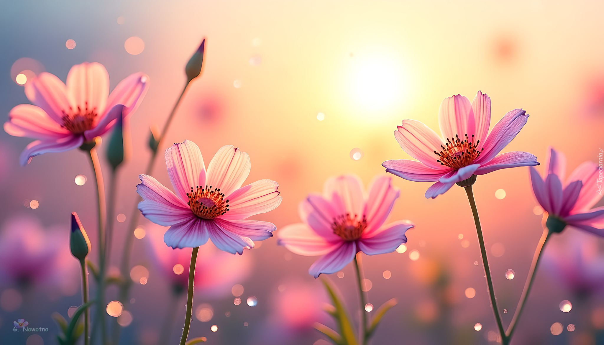 Edytor tapety: Rozświetlone różowe kwiaty na tle nieba