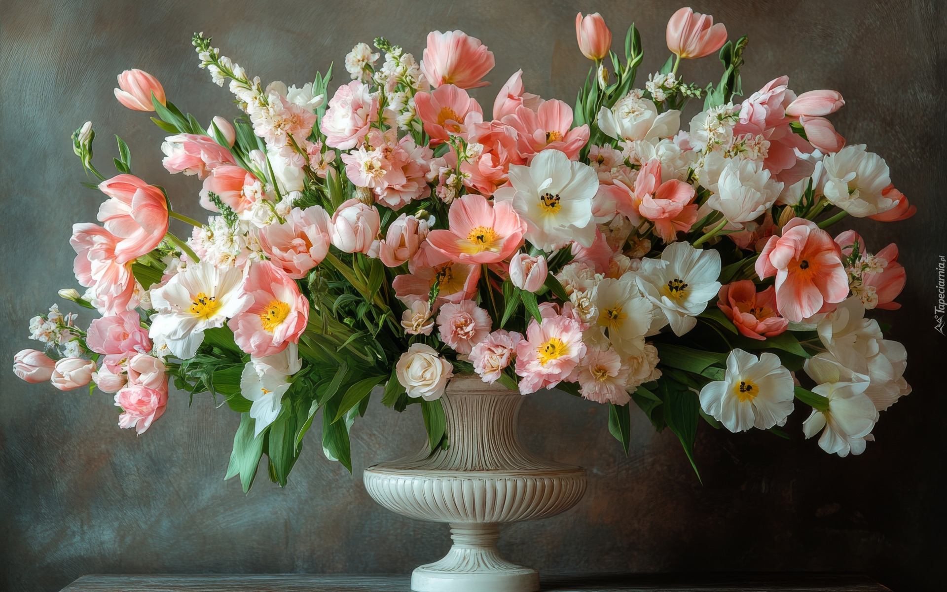Edytor tapety: Bukiet kolorowych kwiatów w białej wazie