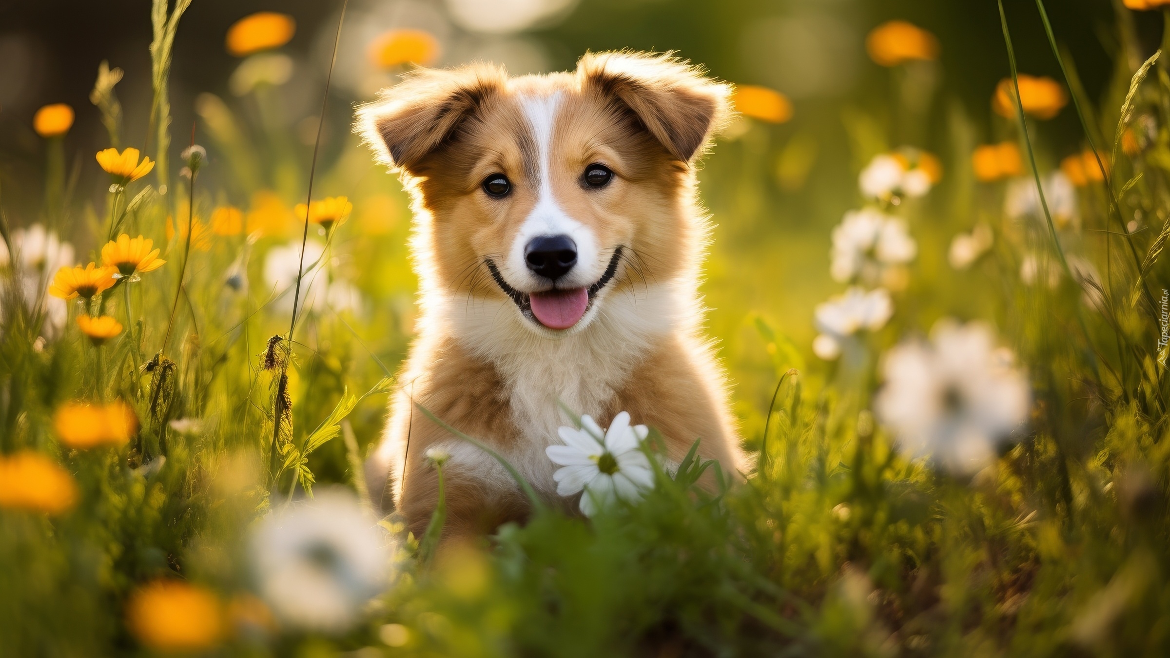 Edytor tapety: Biało-brązowy szczeniak wśród kwiatów na łące