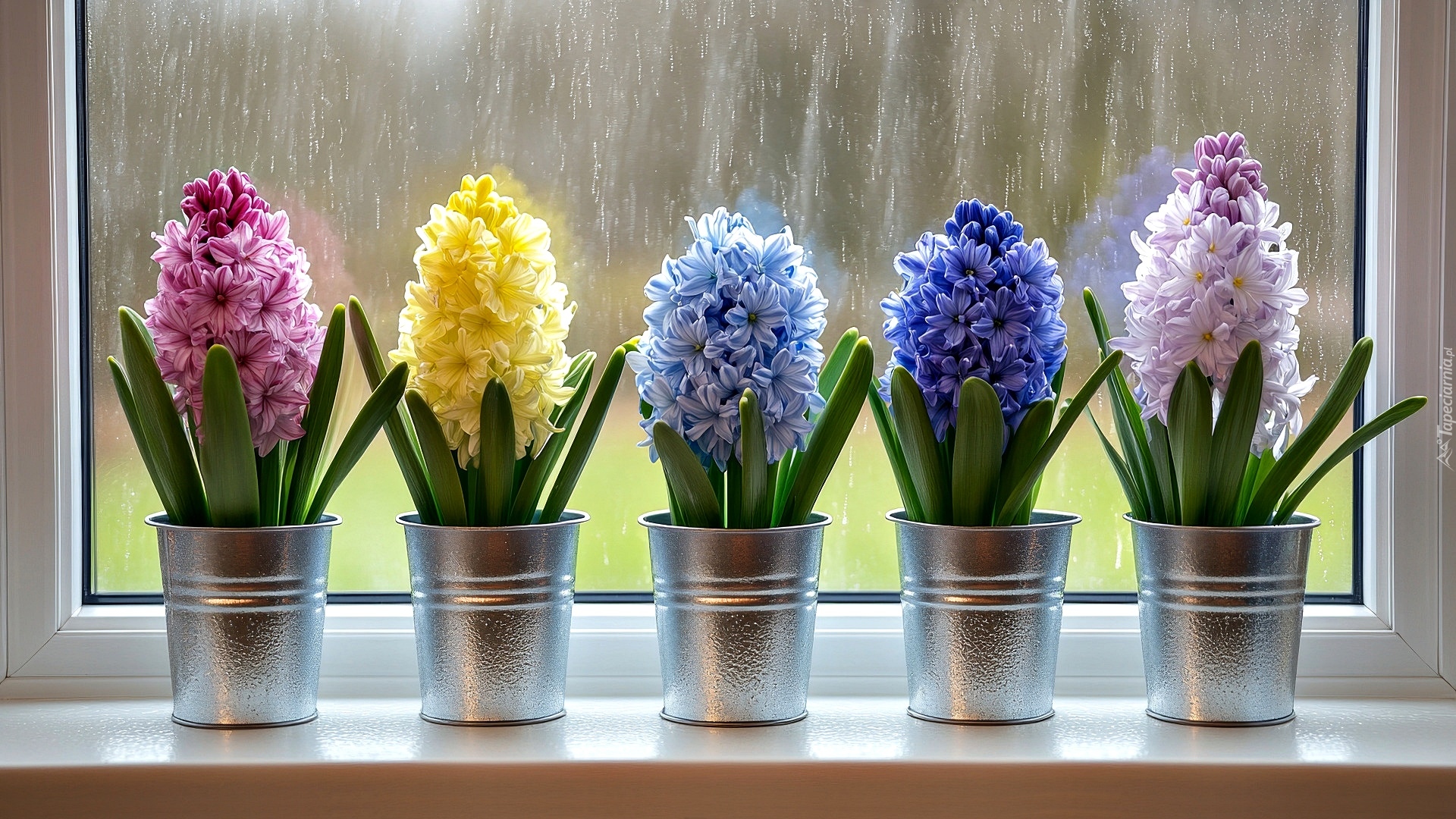 Edytor tapety: Pięć kolorowych hiacyntów na tle mokrej szyby