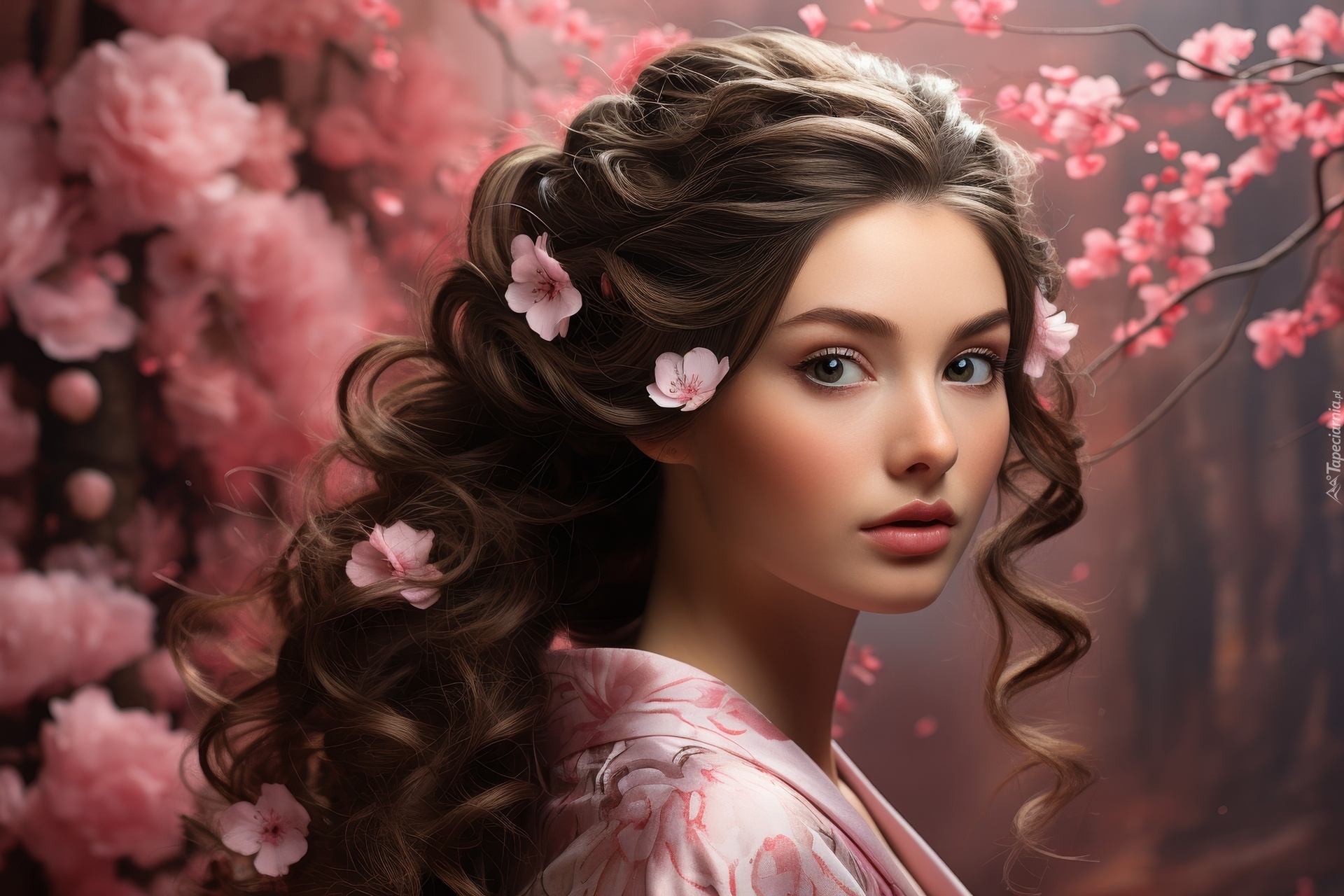 Edytor tapety: Kobieta z długimi kręconymi włosami wśród kwitnących drzew