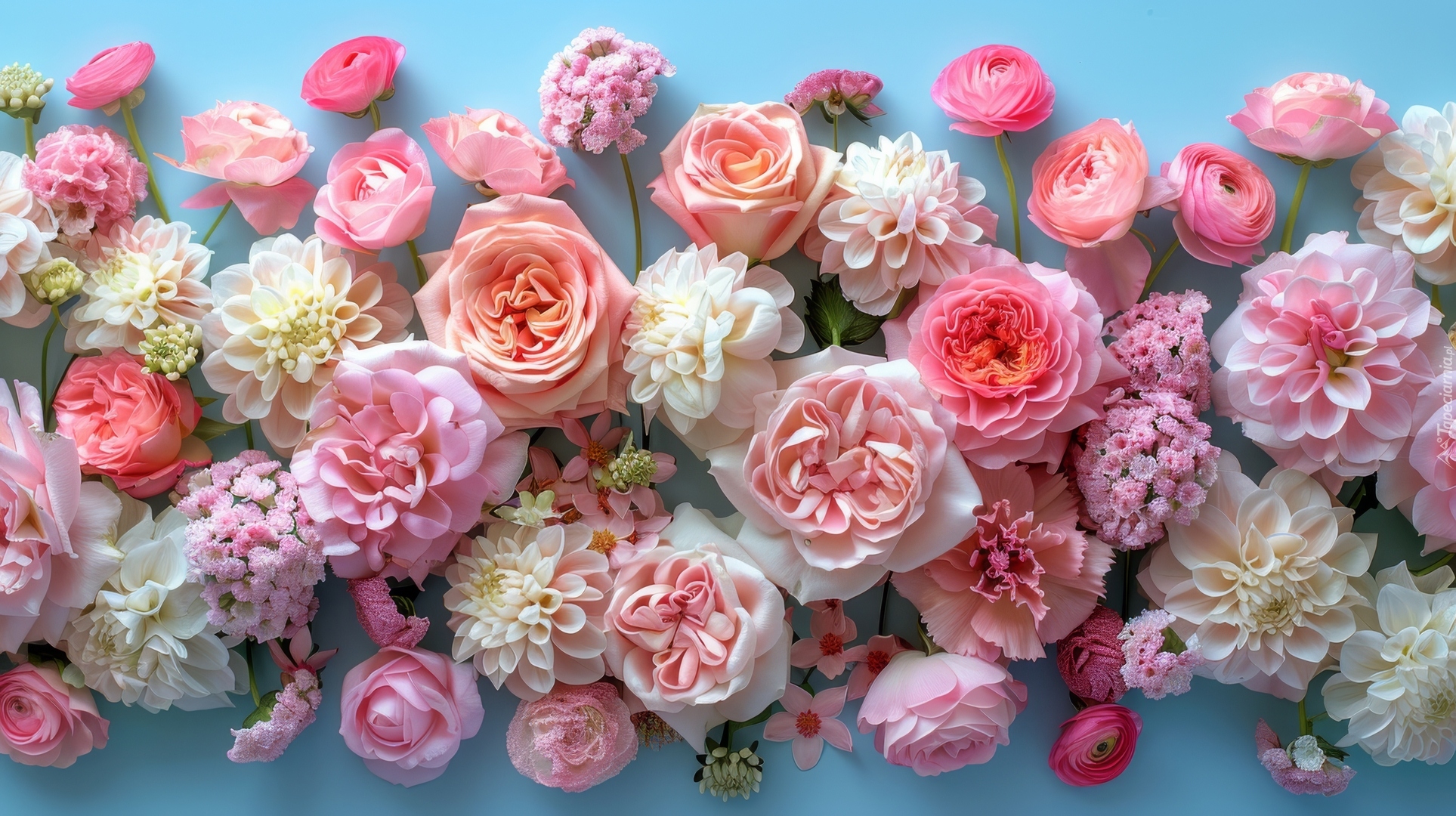 Edytor tapety: Różowe dalie i róże na niebieskim tle