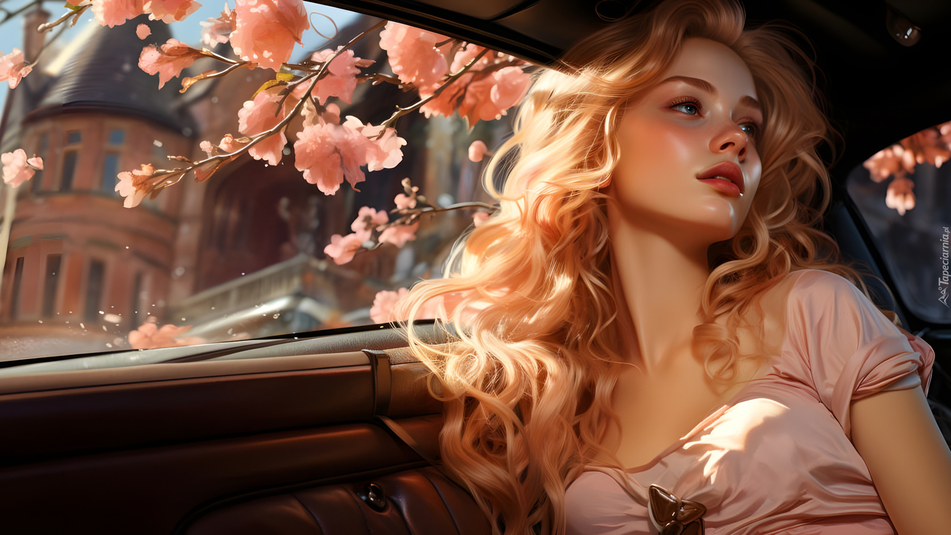 Edytor tapety: Dziewczyna z długimi blond włosami siedząca w samochodzie