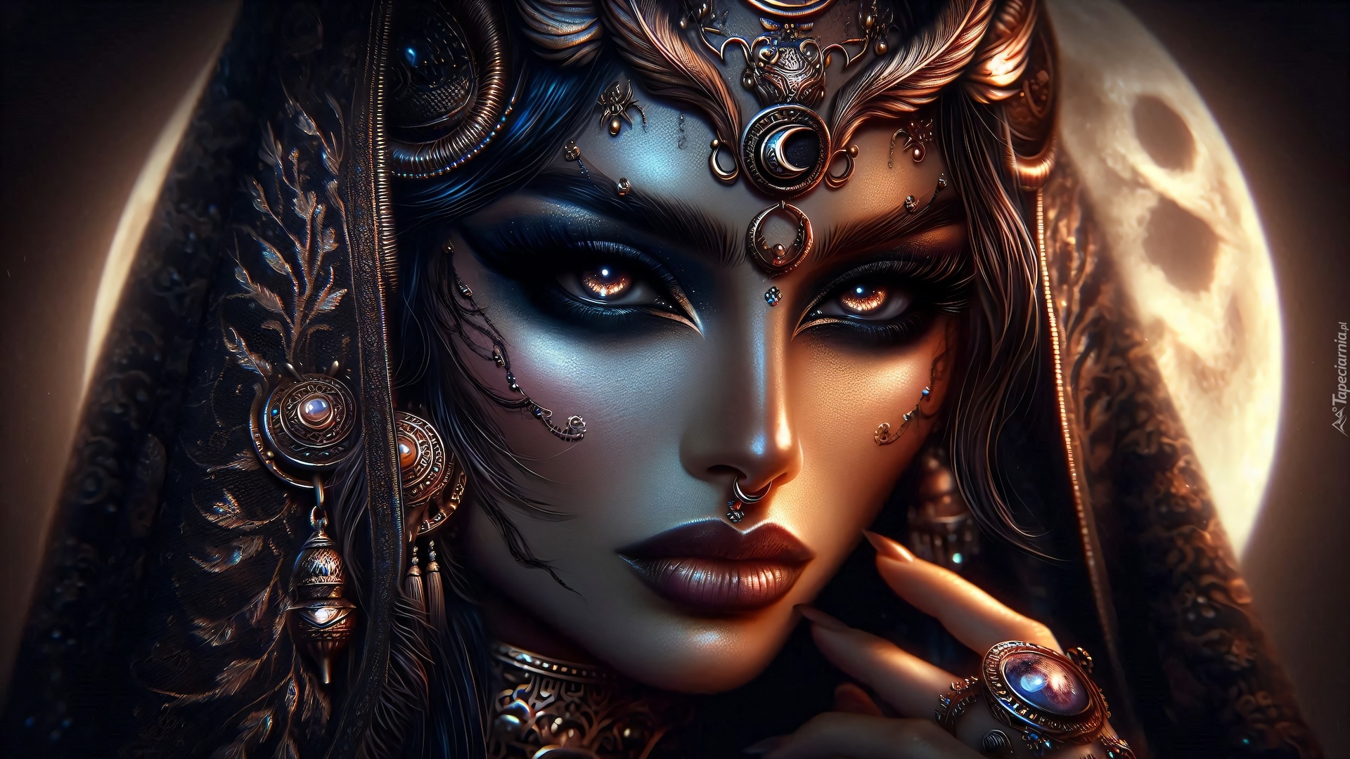 Edytor tapety: Twarz kobiety z biżuterią i w nakryciu głowy