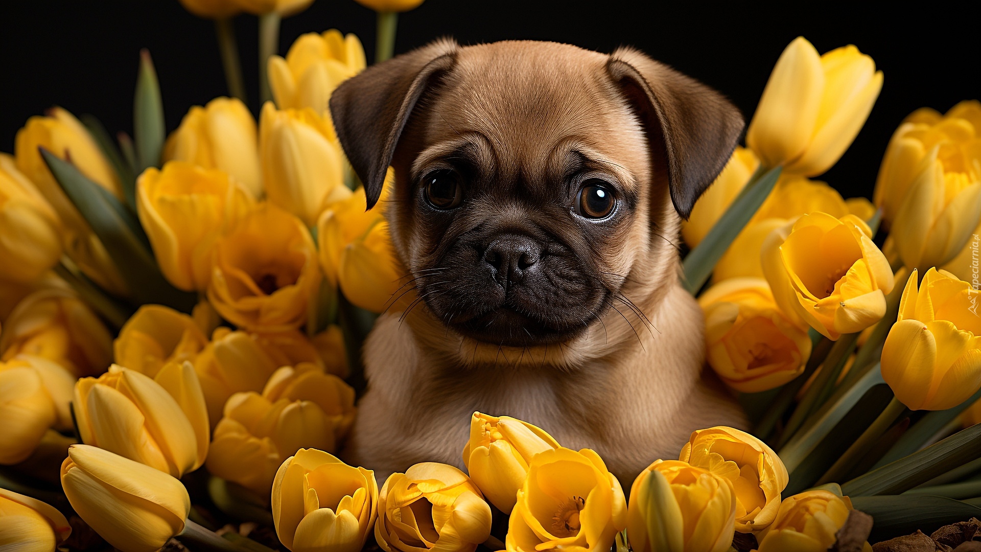 Edytor tapety: Szczeniak mopsa wśród żółtych tulipanów