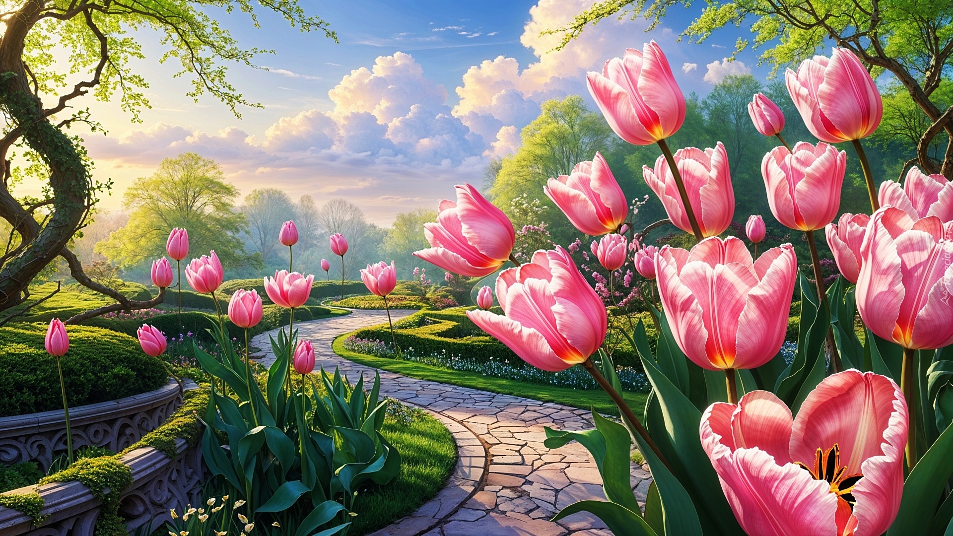 Edytor tapety: Różowe tulipany przy kamienistej ścieżce w parku