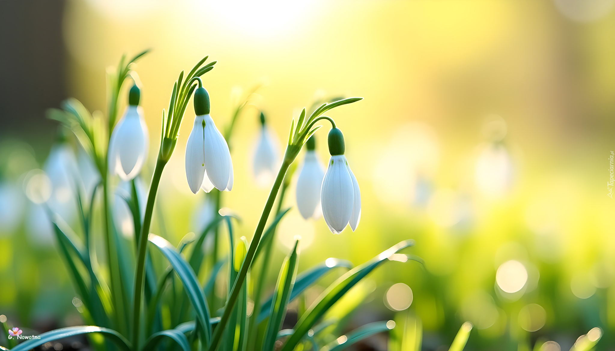 Edytor tapety: Kępka białych przebiśniegów na słonecznym tle