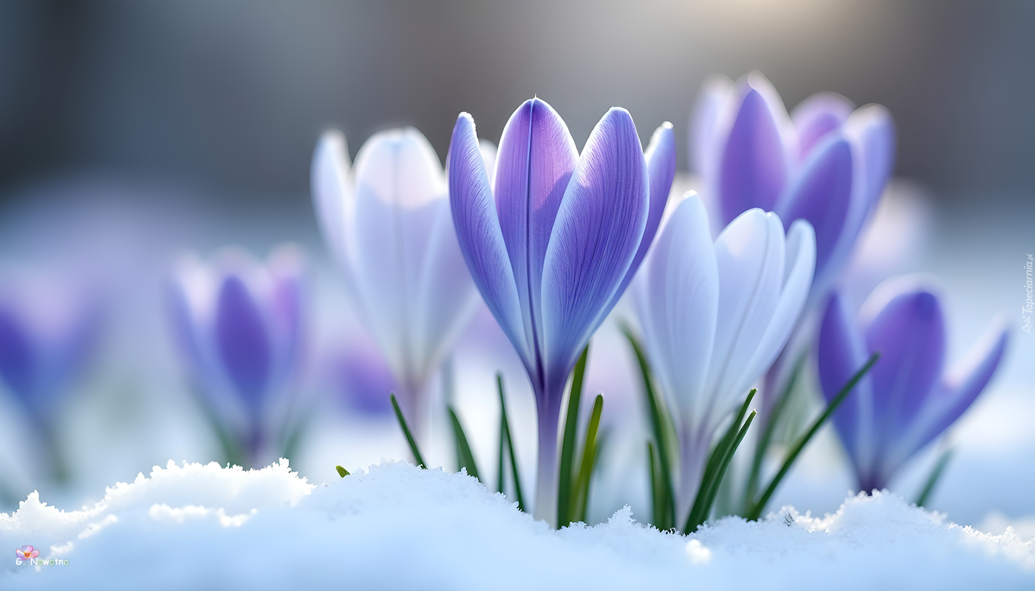 Edytor tapety: Białe i jasnofioletowe krokusy w śniegu