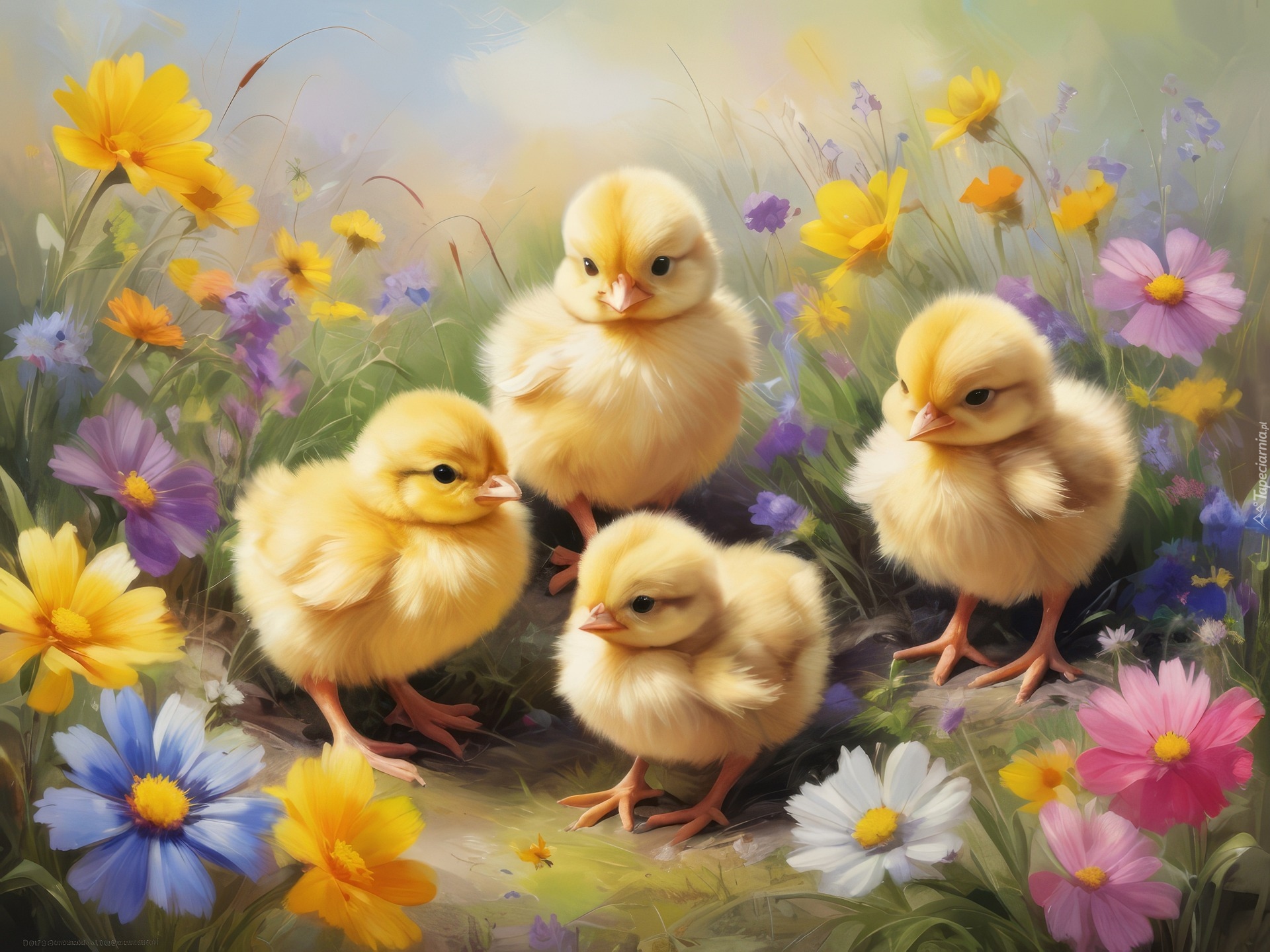 Edytor tapety: Małe żółte kurczęta wśród kwiatów