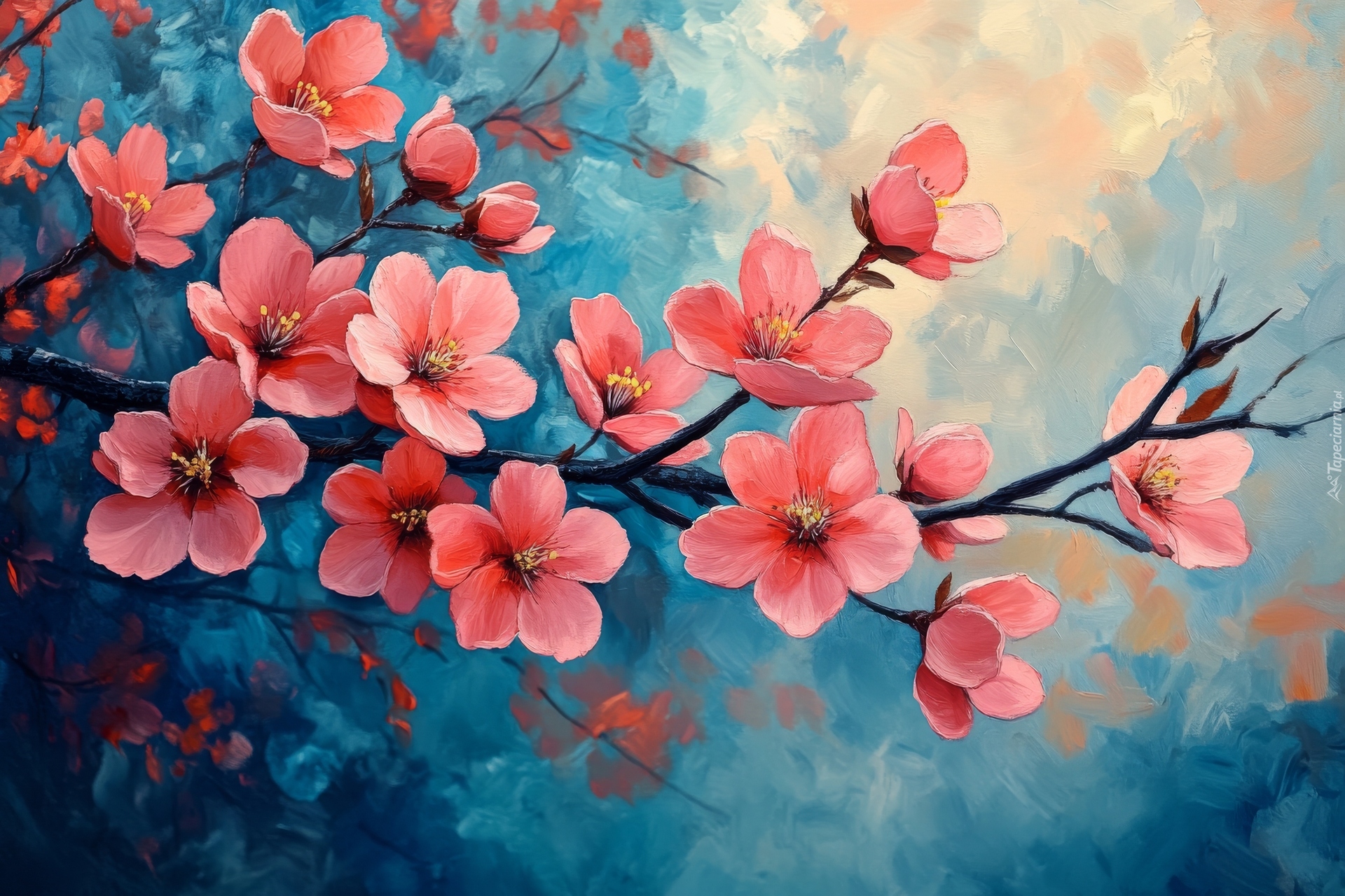 Edytor tapety: Gałązka z czerwonymi kwiatami na niebieskim tle