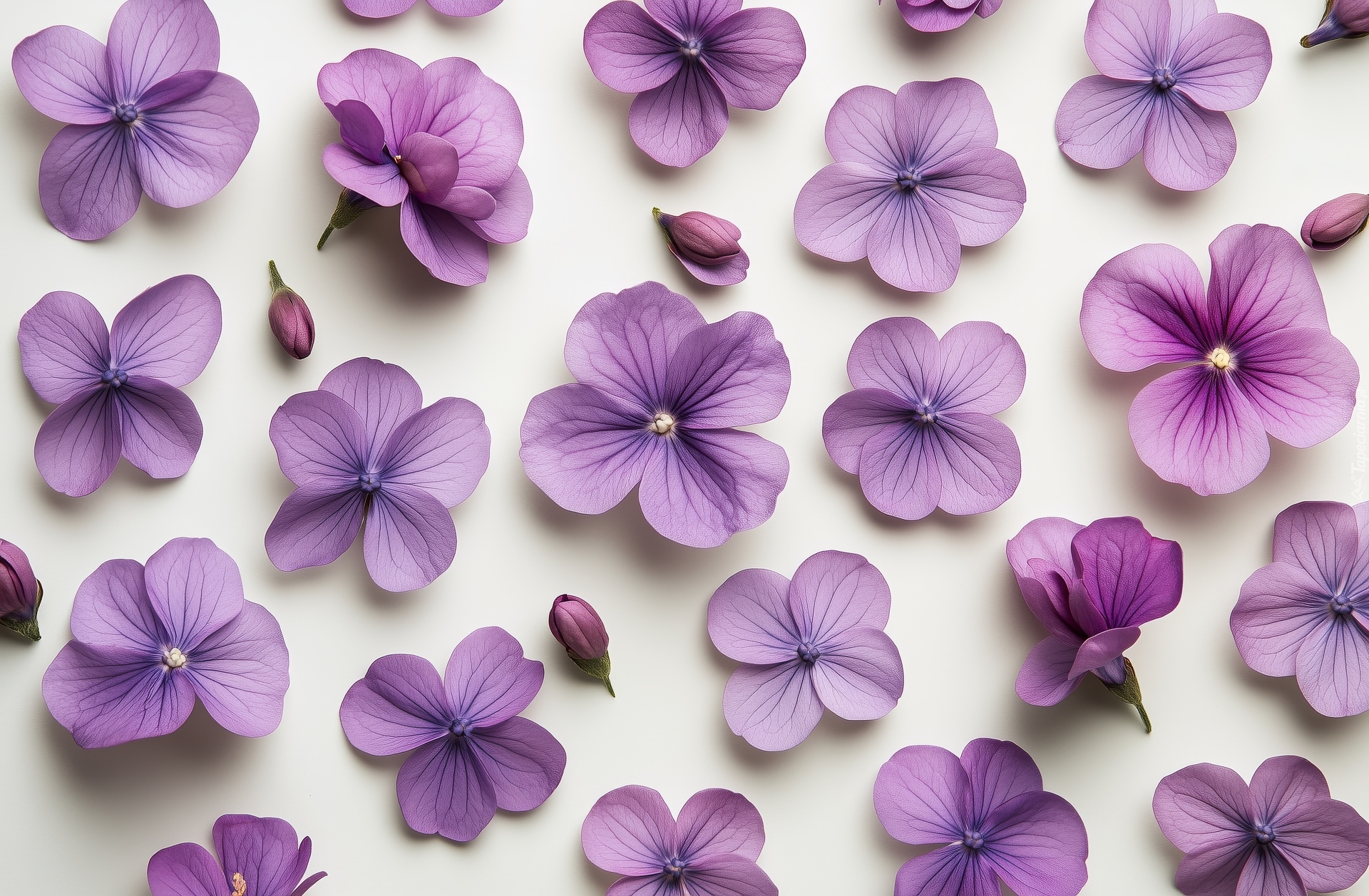 Edytor tapety: Fioletowe kwiaty i pąki na jasnym tle