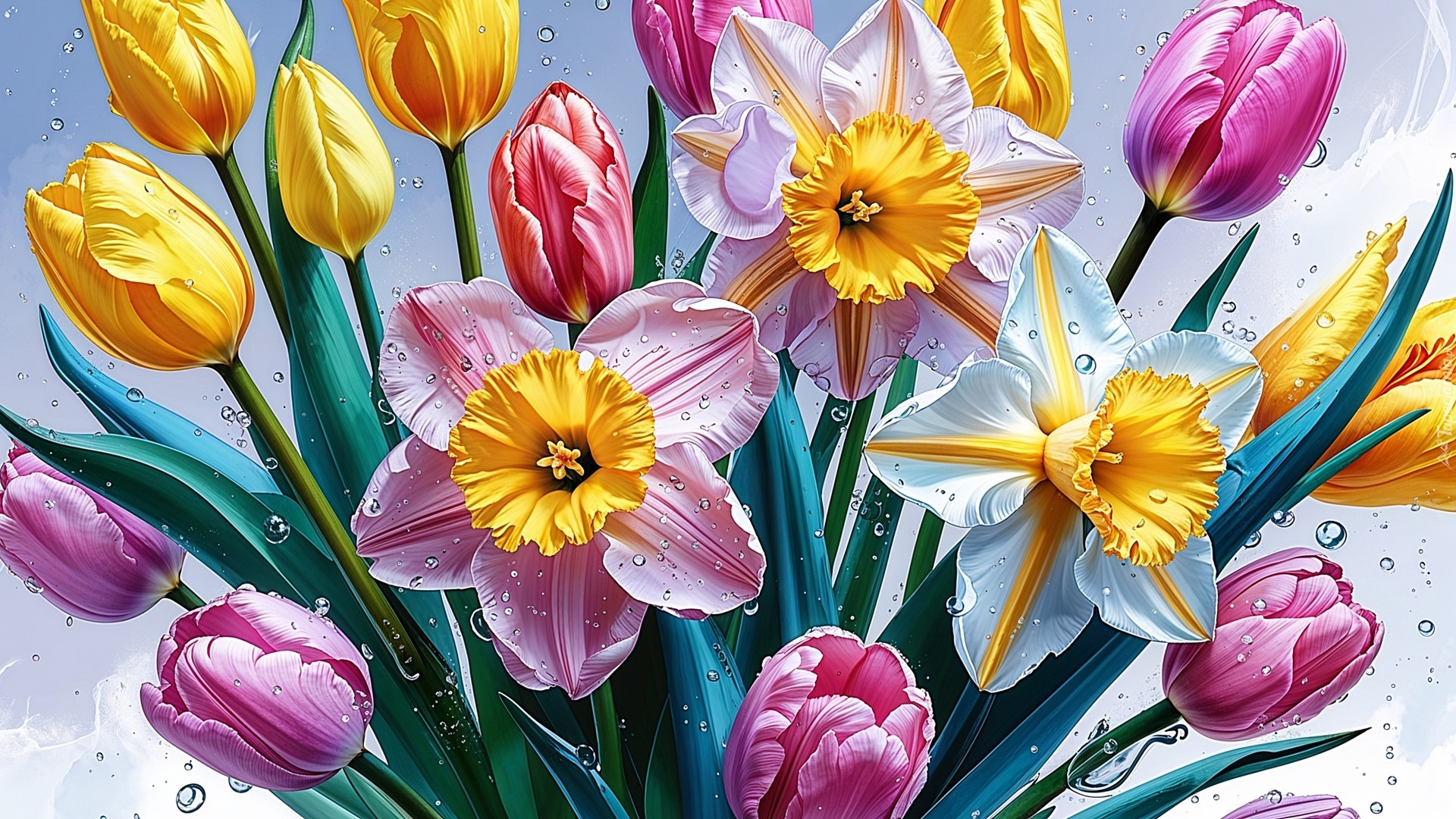 Edytor tapety: Krople na narcyzach i kolorowych tulipanach w grafice