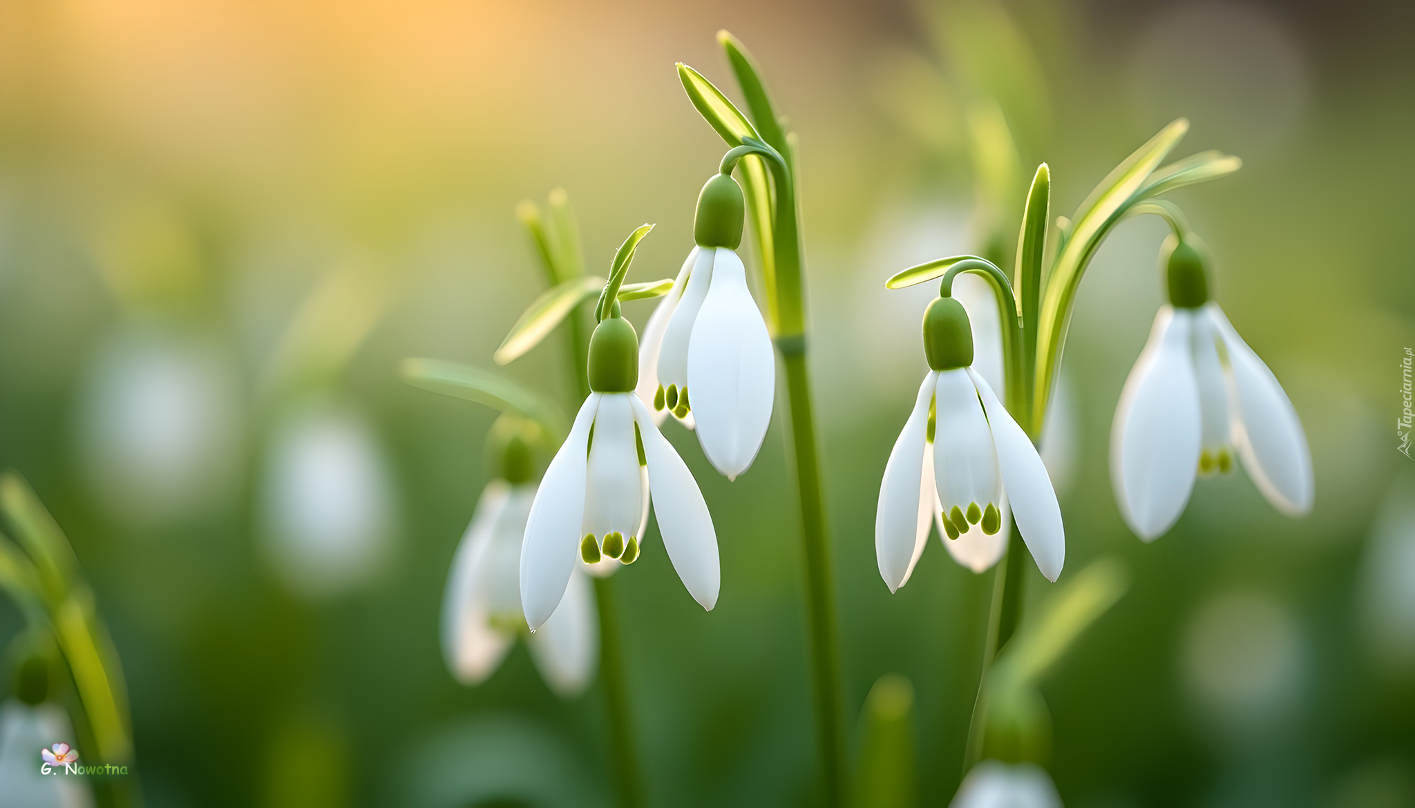 Edytor tapety: Pochylone białe przebiśniegi na rozświetlonym zielonym tle