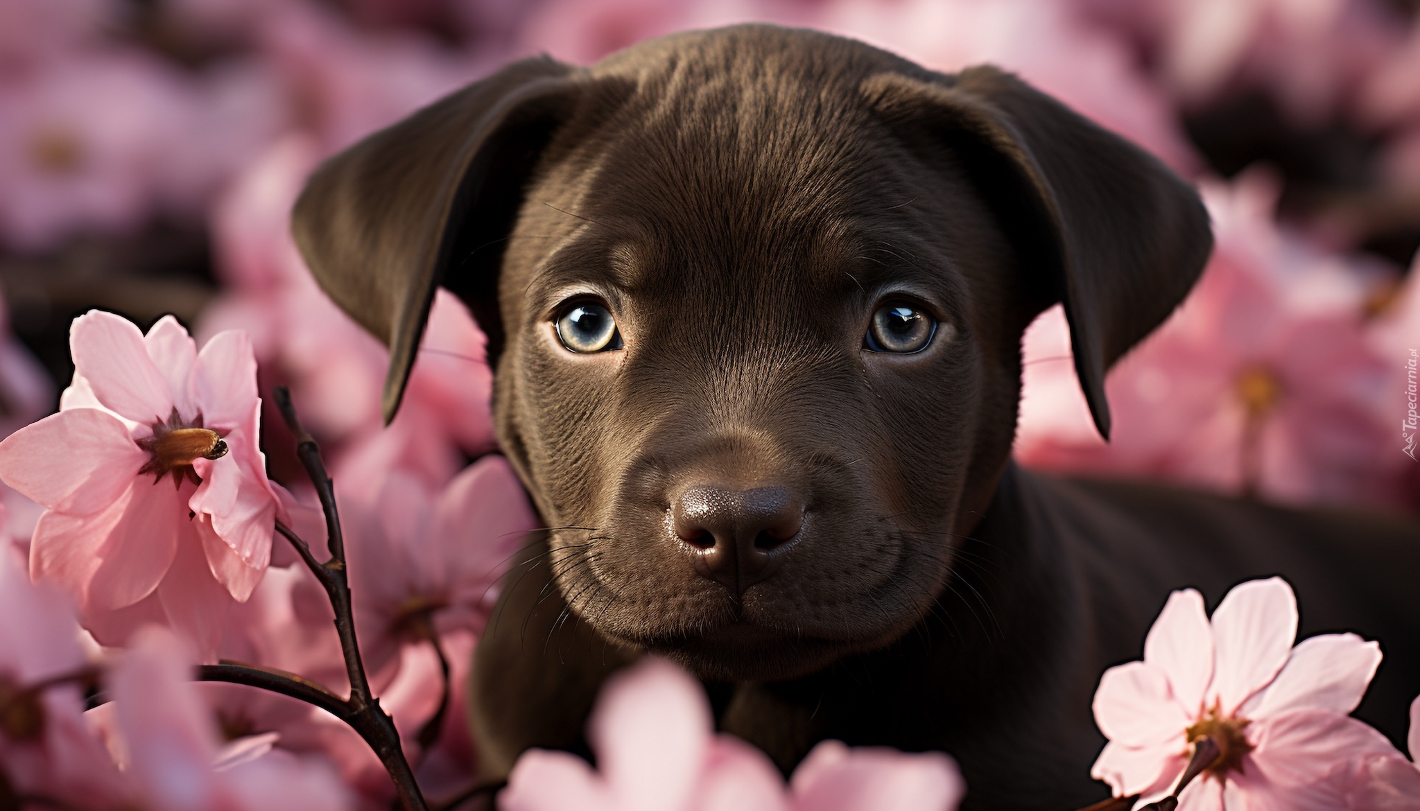 Edytor tapety: Szczeniak wśród różowych kwiatów