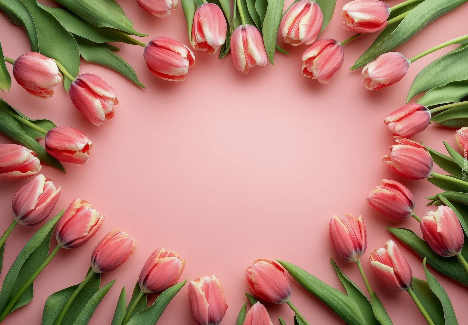 Edytor tapety: Różowe tulipany z liśćmi ułożone na różowym tle