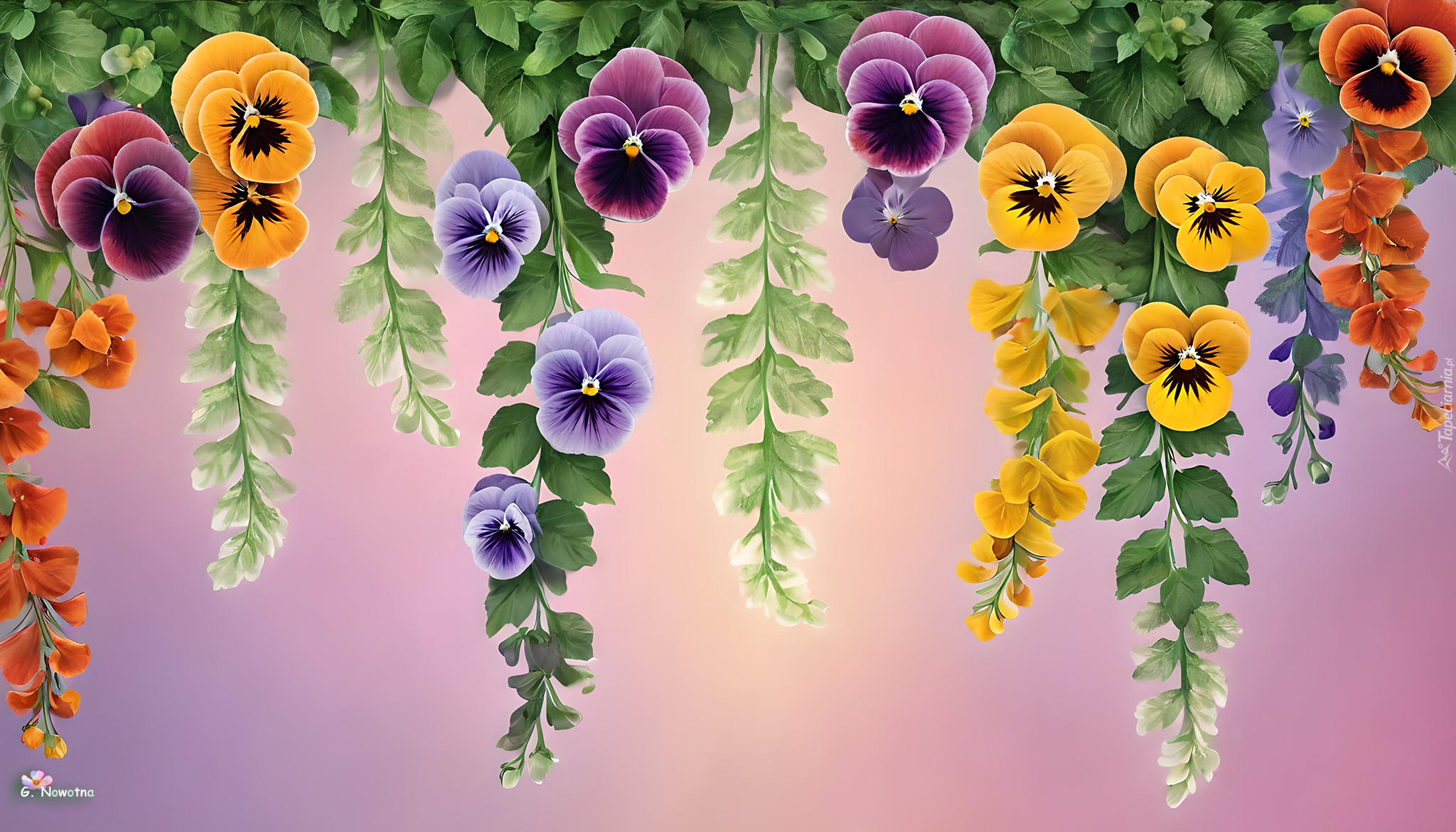 Edytor tapety: Kolorowe bratki na wiszących roślinach