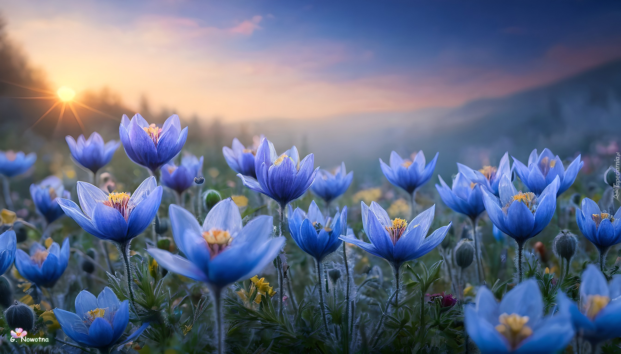 Edytor tapety: Niebieskie kwiaty z żółtymi pręcikami