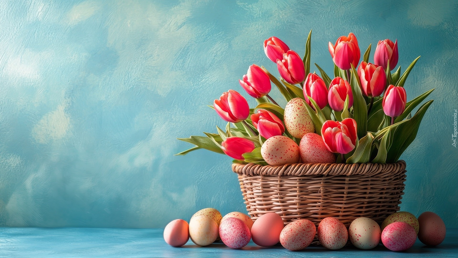 Edytor tapety: Tulipany w koszyczku wśród pisanek