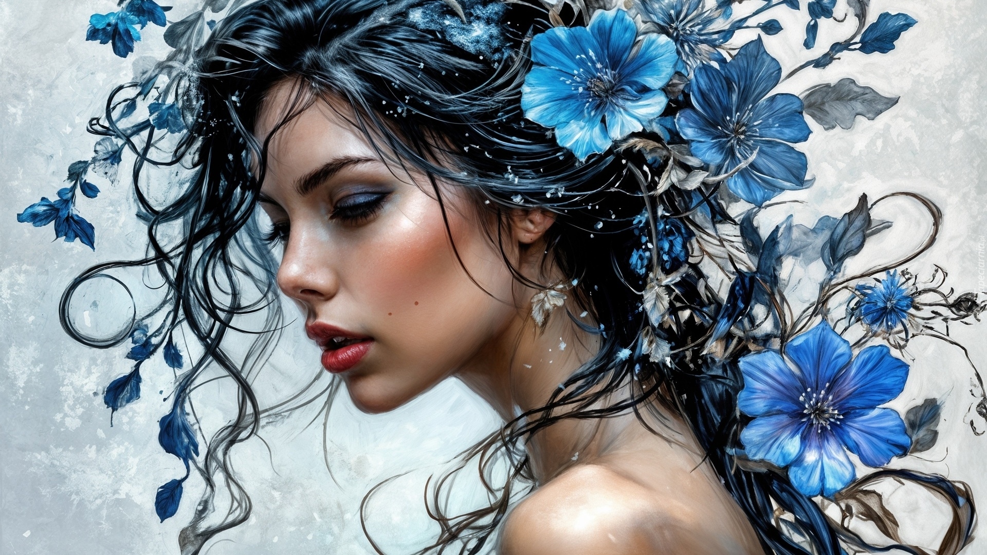 Edytor tapety: Twarz dziewczyny z niebieskimi kwiatami we włosach