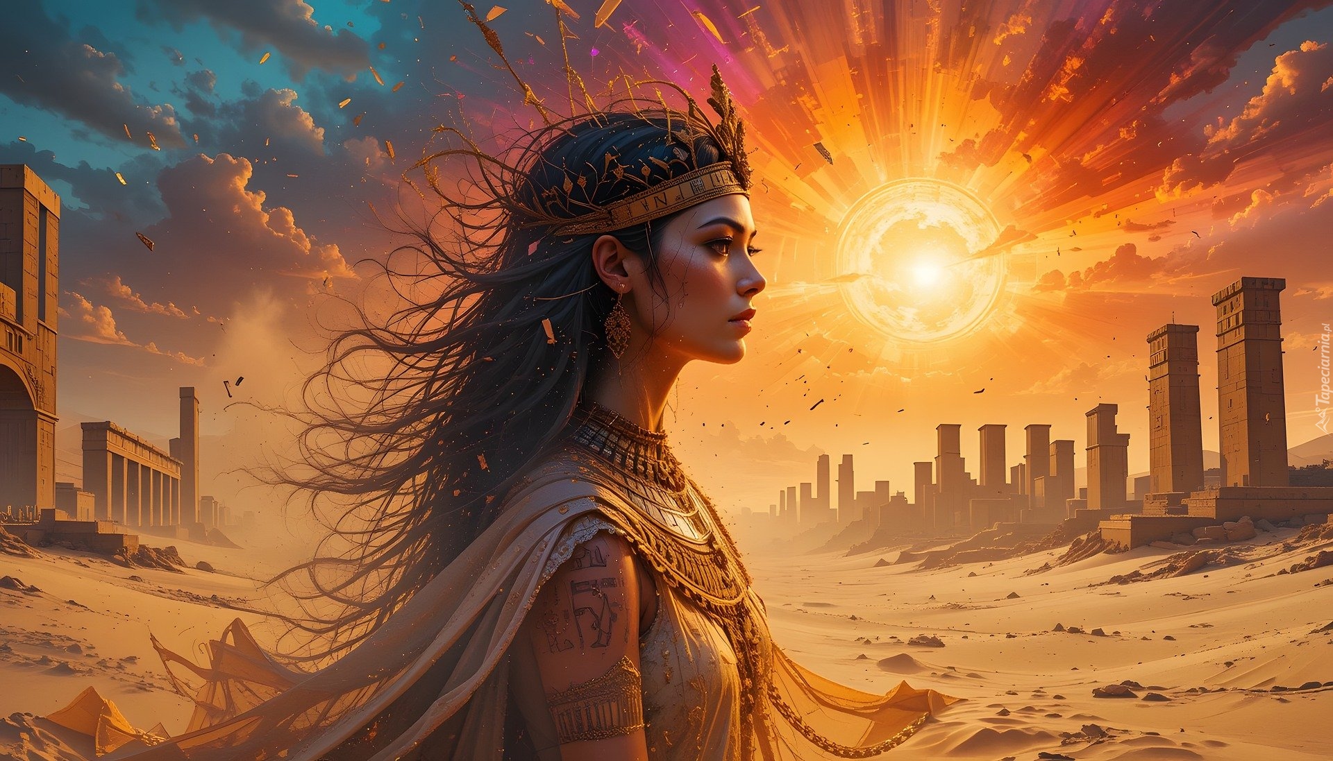 Edytor tapety: Egipcjanka i budowle na pustyni w słonecznym blasku