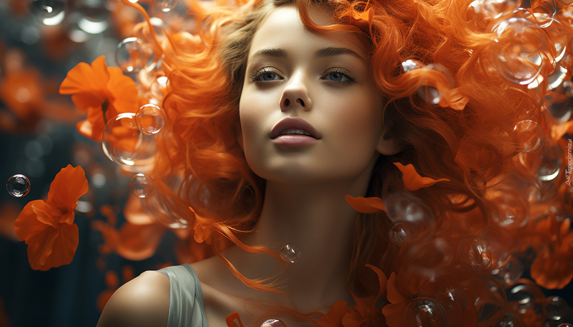 Edytor tapety: Rudowłosa kobieta i bańki mydlane