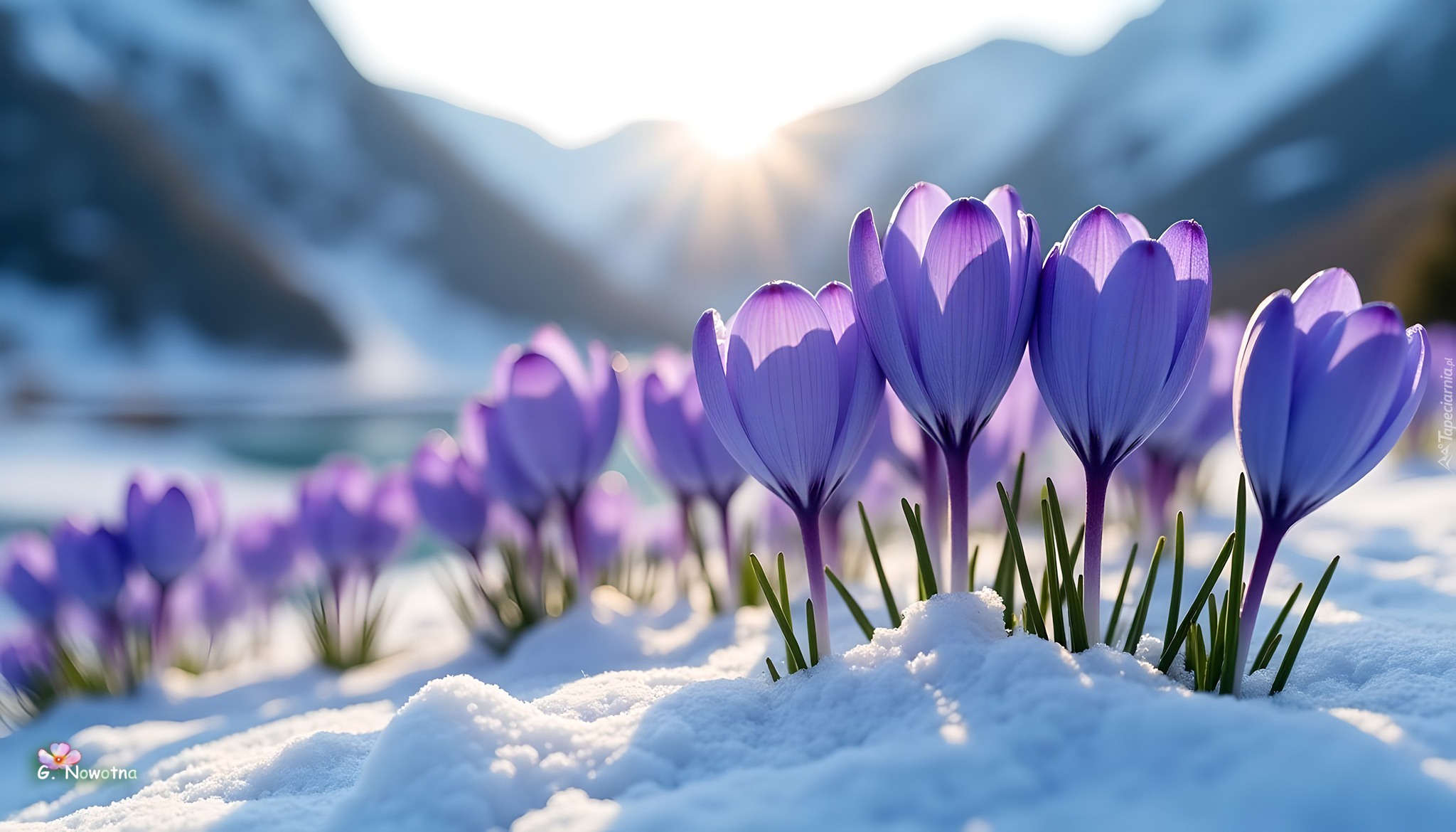 Edytor tapety: Rozświetlone promieniami słońca fioletowe krokusy w śniegu