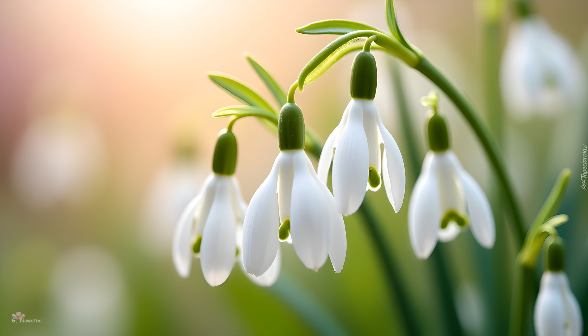 Edytor tapety: Pochylone białe przebiśniegi na rozświetlonym tle