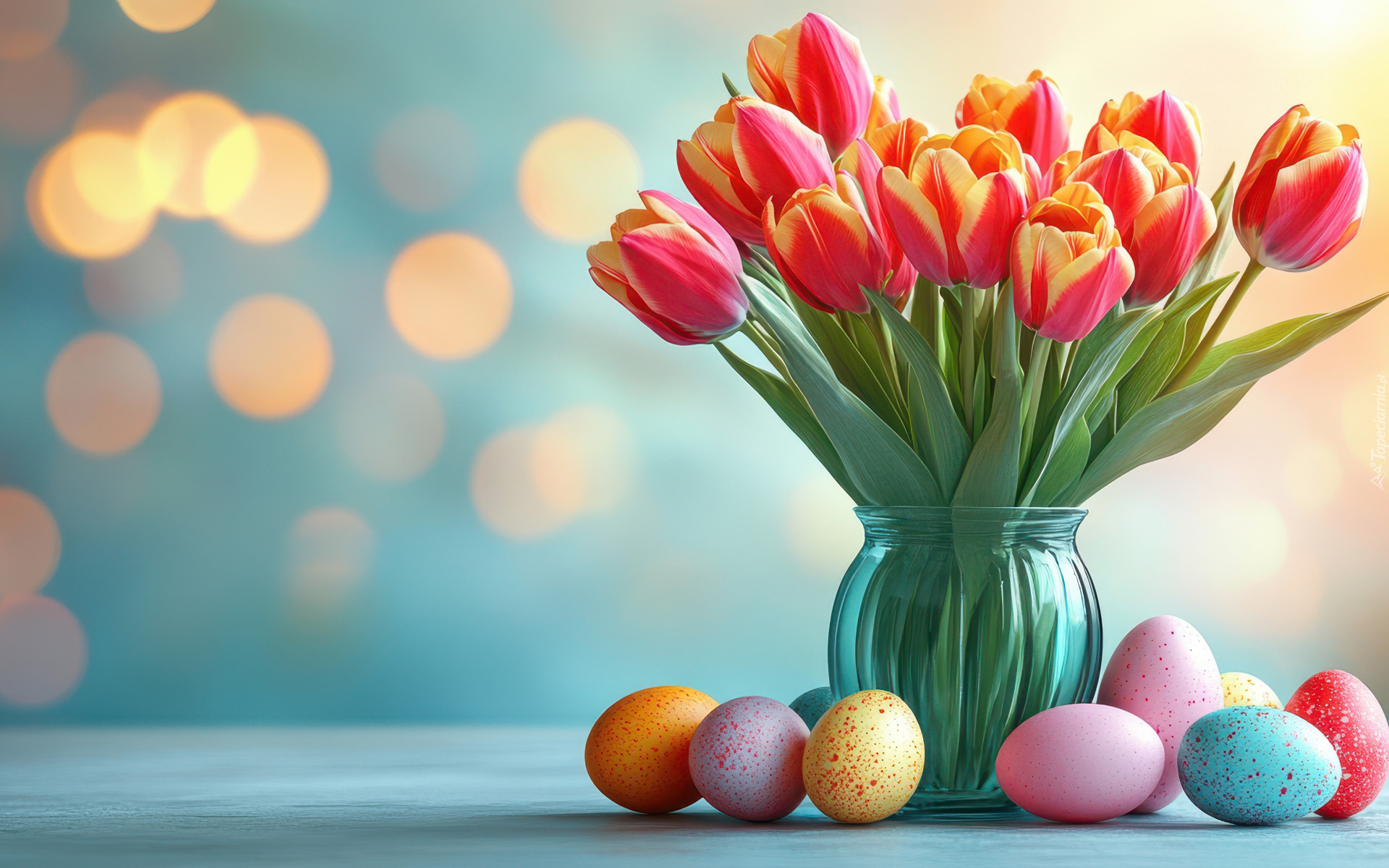 Edytor tapety: Kolorowe pisanki obok wazonu z żółto-czerwonymi tulipanami
