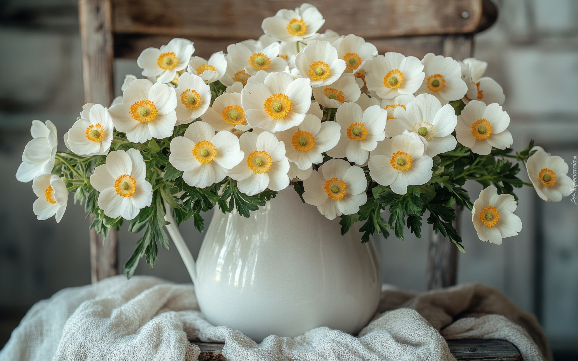 Edytor tapety: Białe zawilce w białym dzbanku na krześle