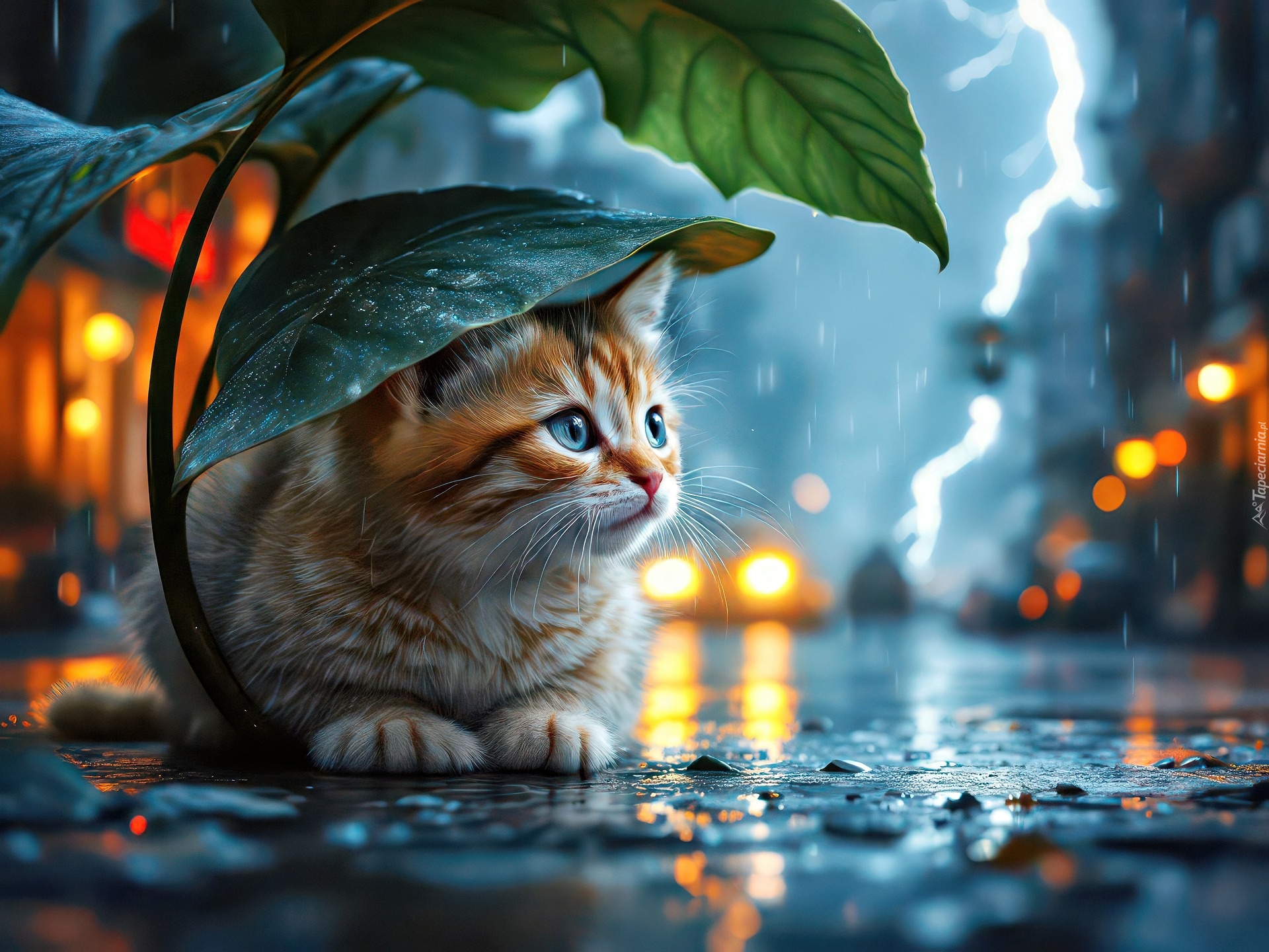 Edytor tapety: Kot pod liściem na mokrej ulicy