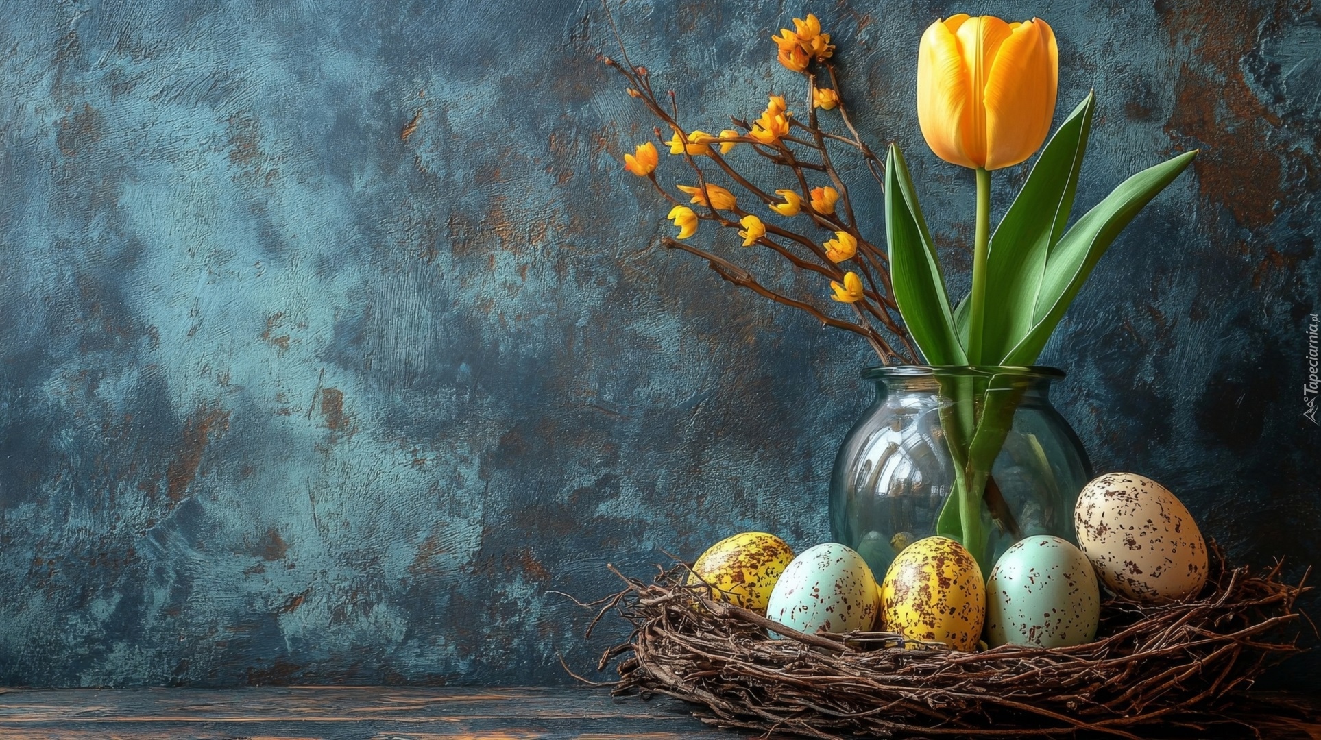 Edytor tapety: Pisanki w gniazdku i żółty tulipan w wazonie