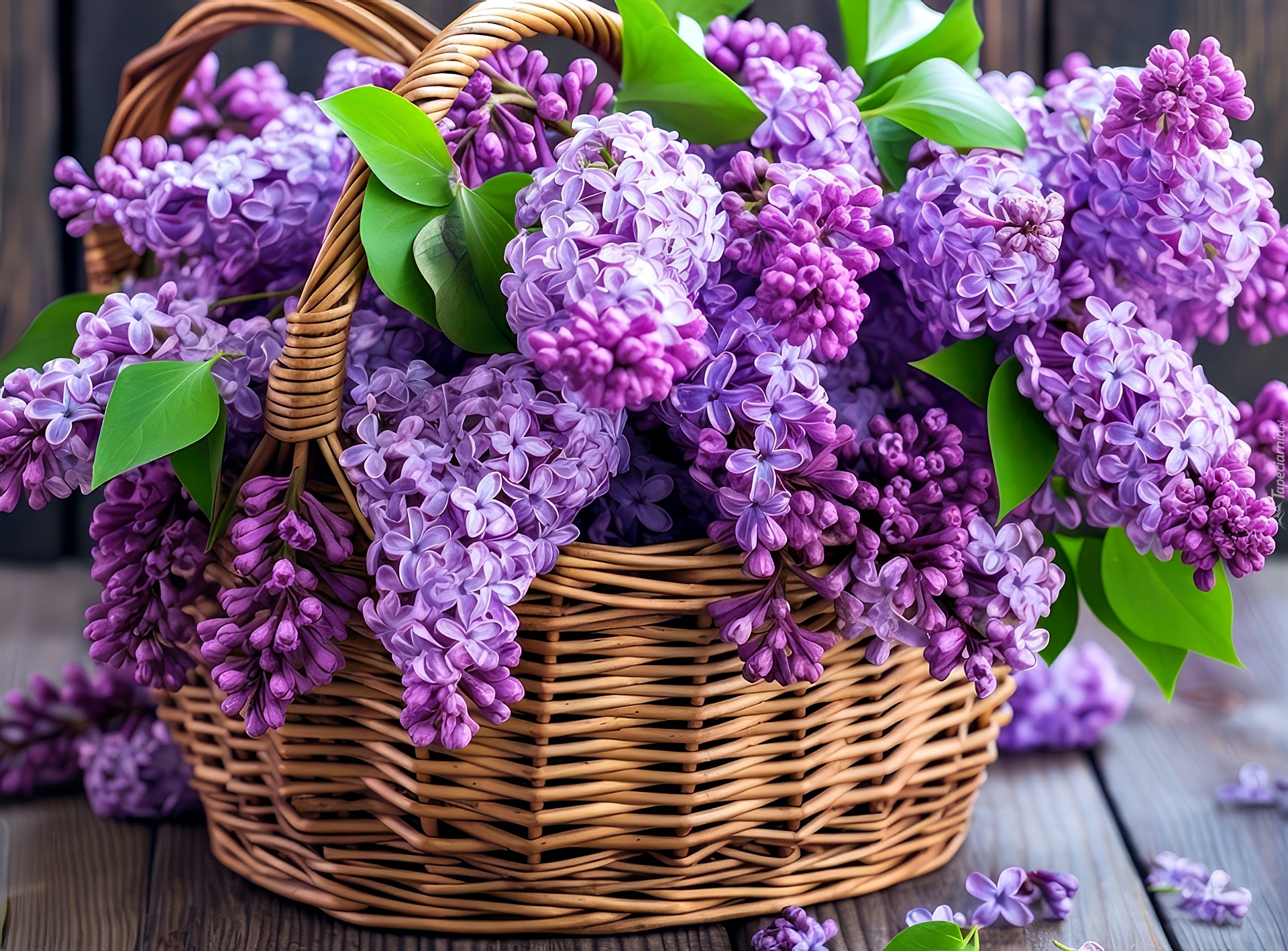 Edytor tapety: Fioletowe kwiaty bzu w wiklinowym koszyku