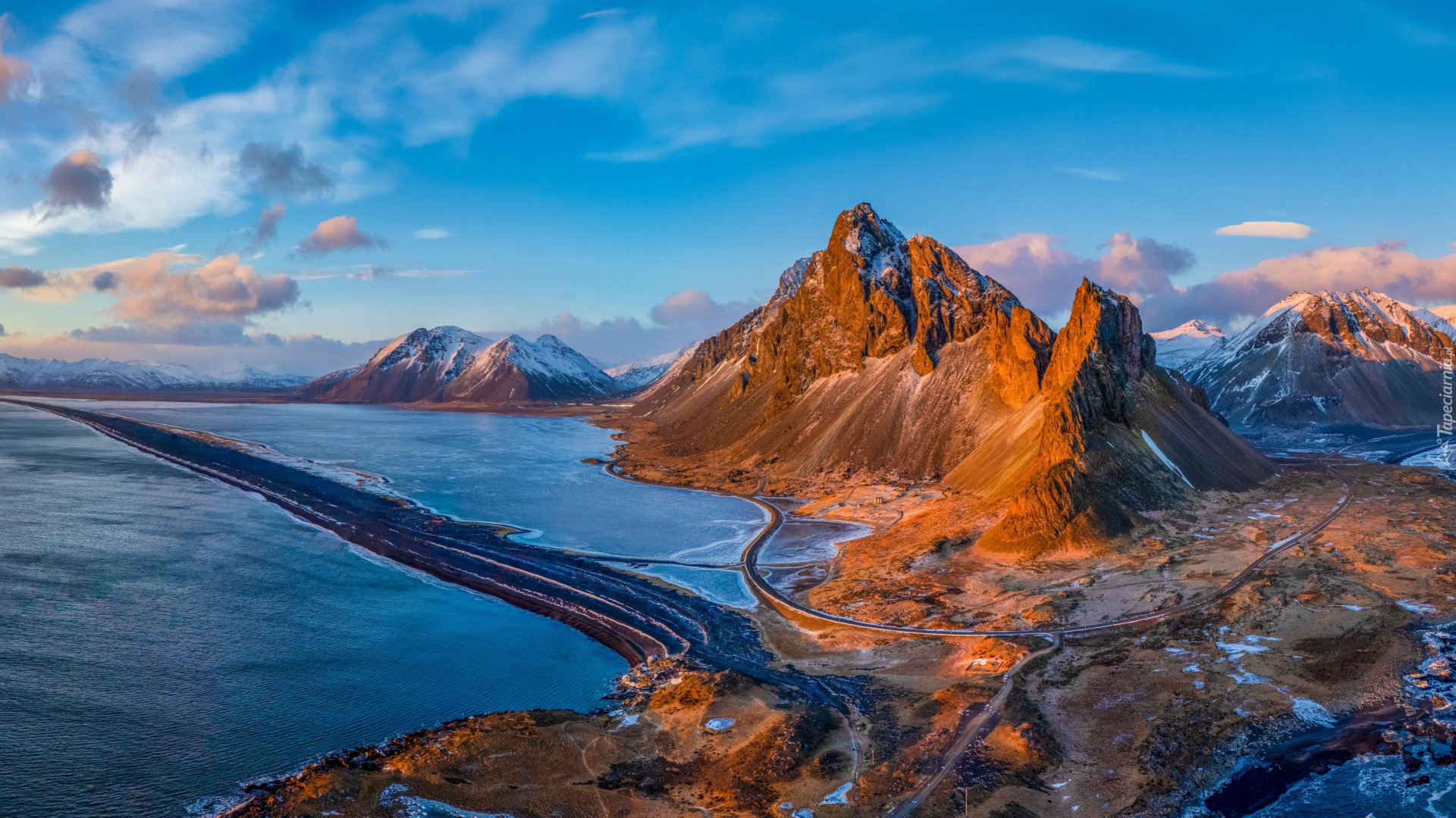 Edytor tapety: Rozświetlona góra Eystrahorn nad morzem w Islandii