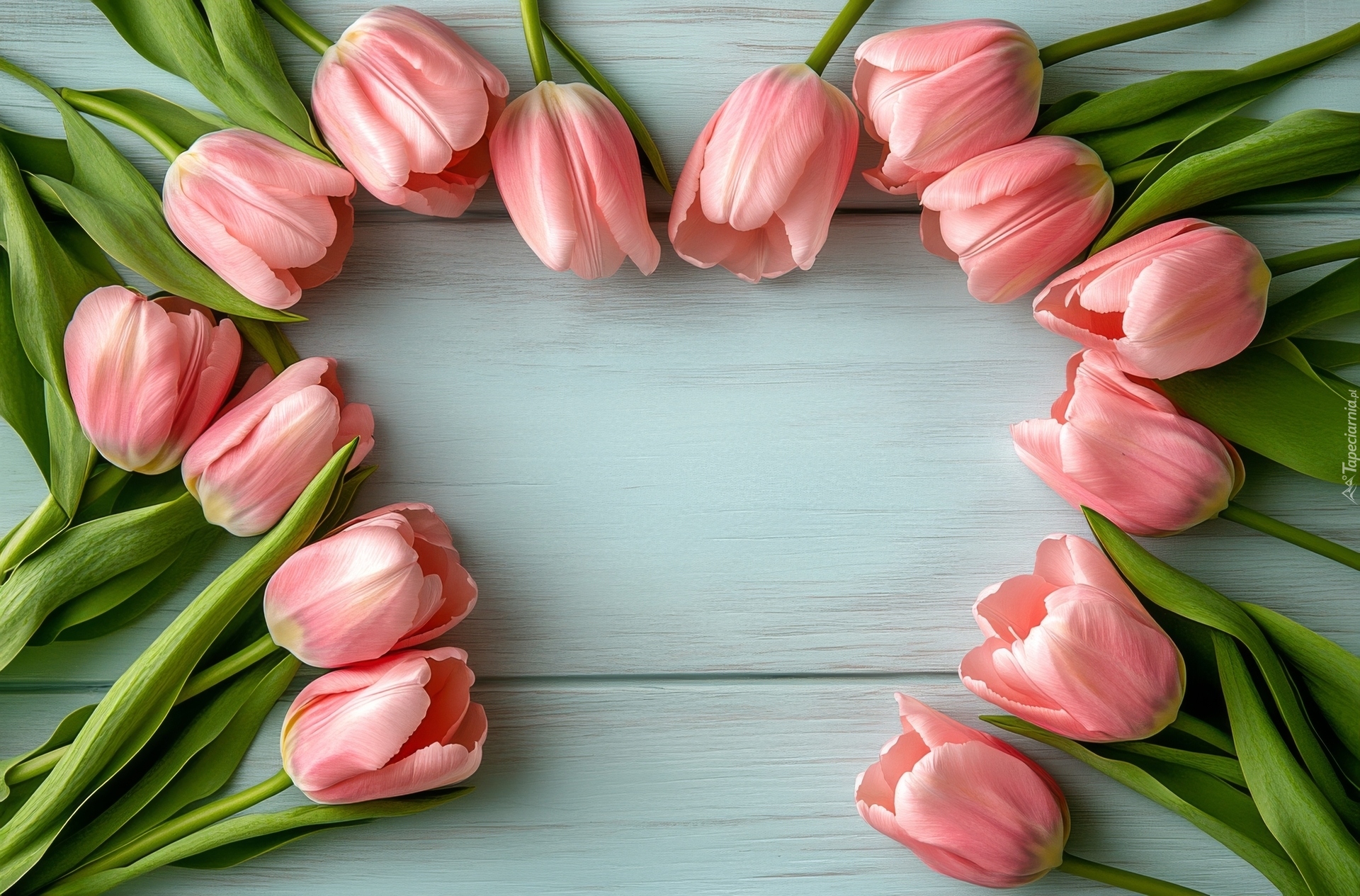 Edytor tapety: Różowe tulipany ułożone na jasnych deskach