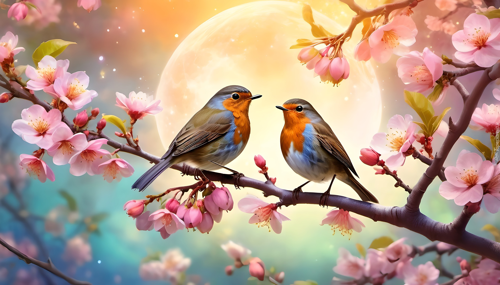 Edytor tapety: Dwa rudziki na gałązce z różowymi kwiatami