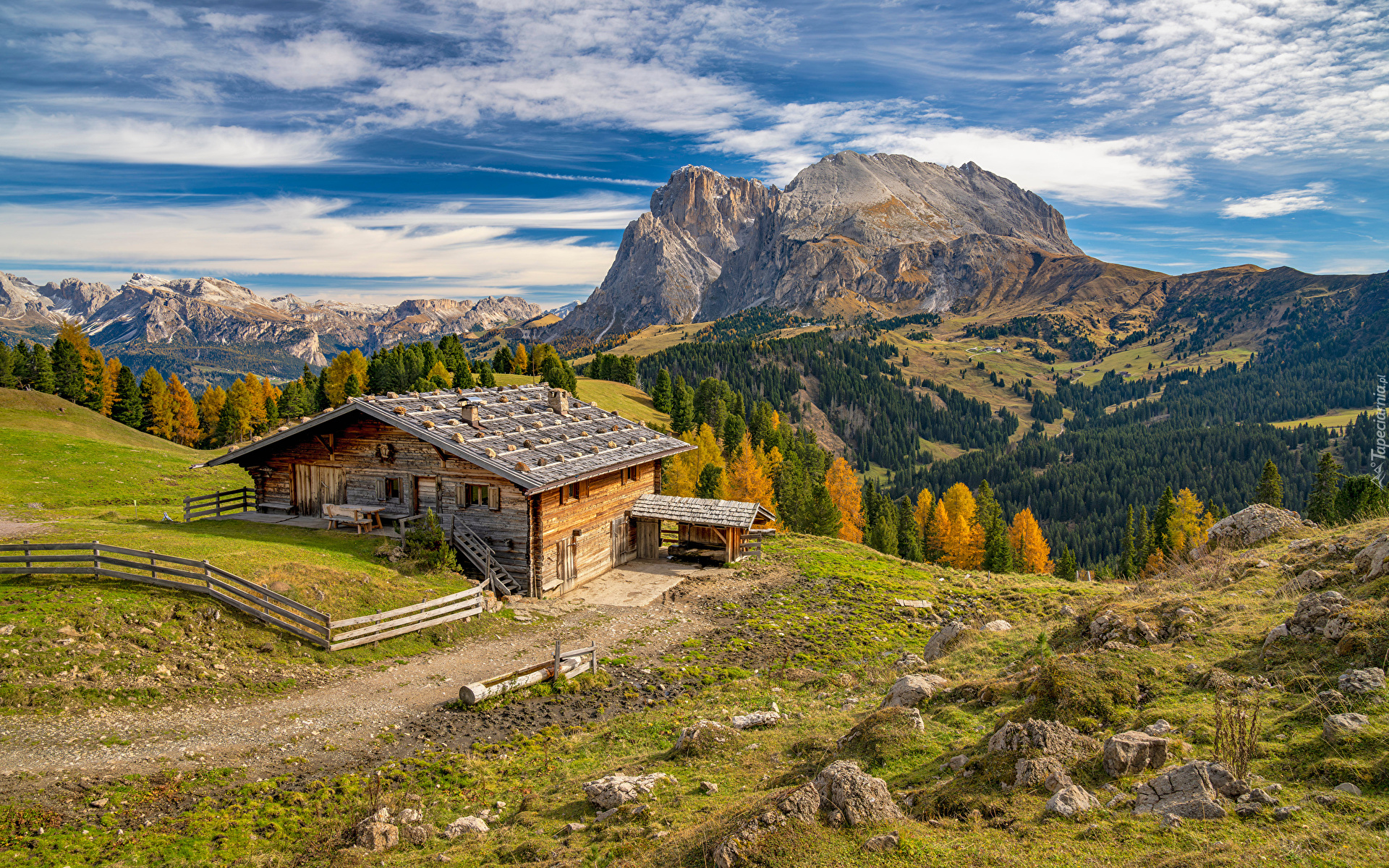 Edytor tapety: Widok na drewniany dom i góry Sassolungo
