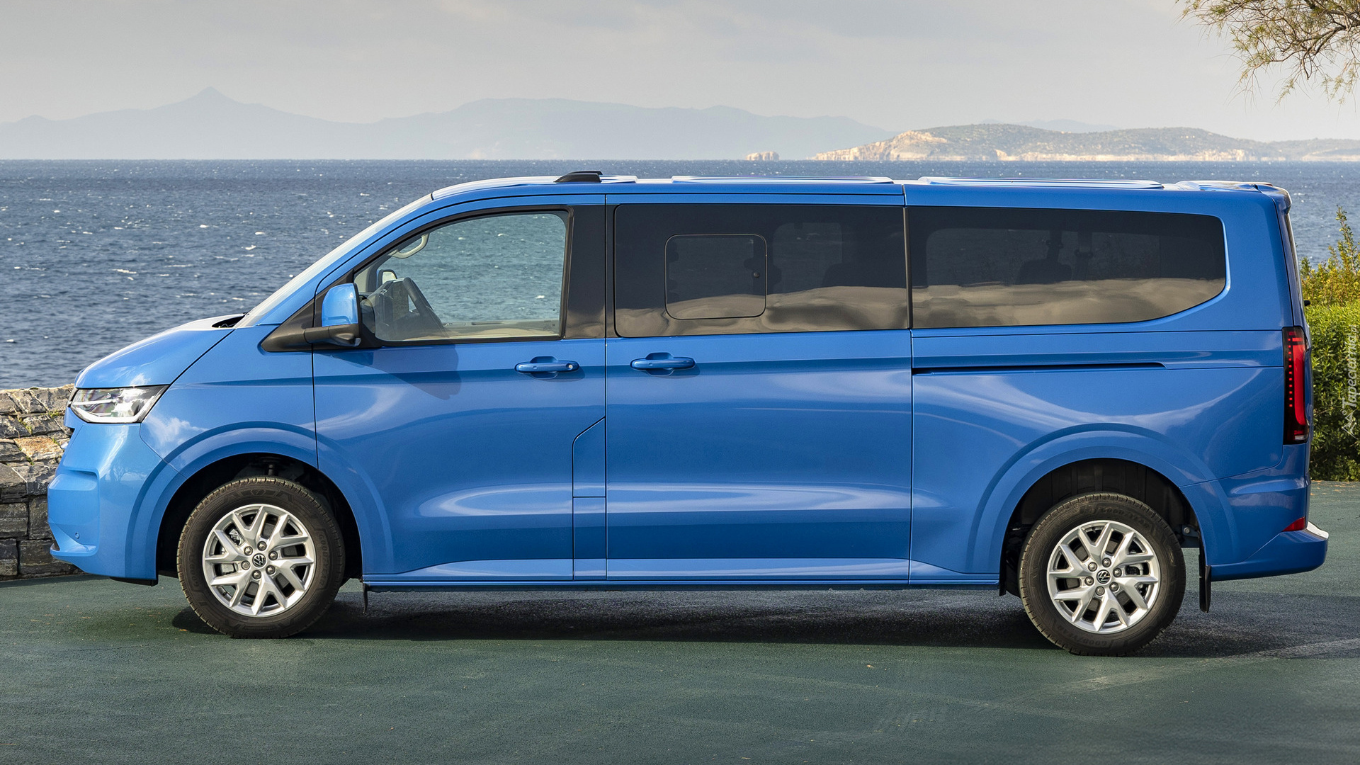 Edytor tapety: Niebieski Volkswagen e-Caravelle bokiem